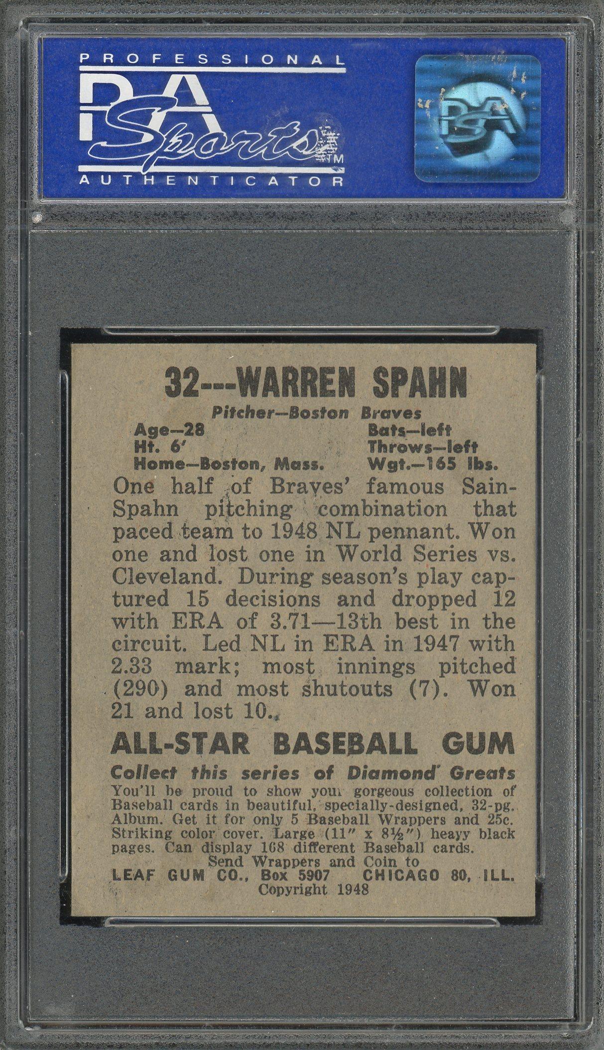 Warren Spahn Boston Braves 1948 Leaf Rookie Card #32. This card has been graded NM MT 8 by PSA (Professional Sports Authenticators).