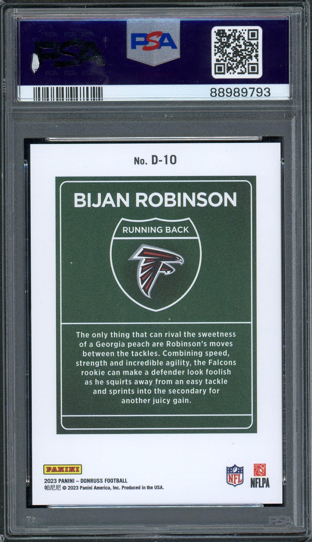 Bijan Robinson Atlanta Falcons 2023 Donruss Downtown! Card #1. This card has been graded Gem Mint 10 by PSA (Professional Sports Authenticators)!