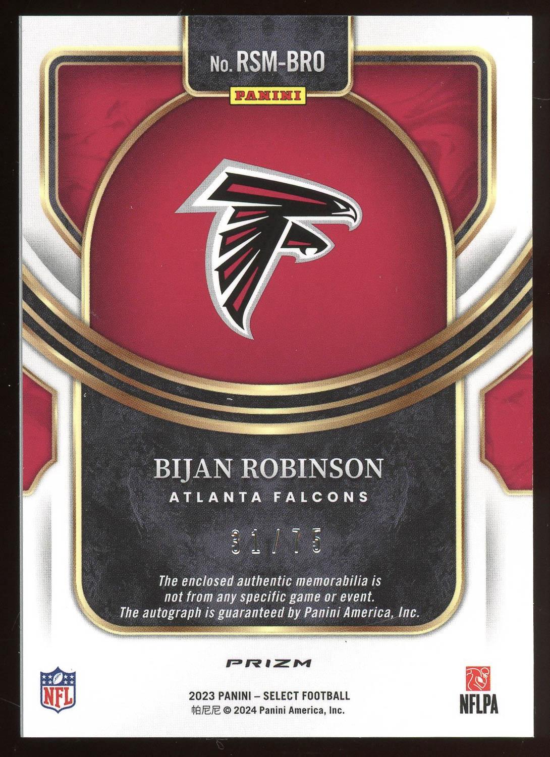Bijan Robinson Atlanta Falcons 2023 Panini Select Blue Autograph Rookie Patch Card 31/75! Please see pictures for details on the condition of this card.