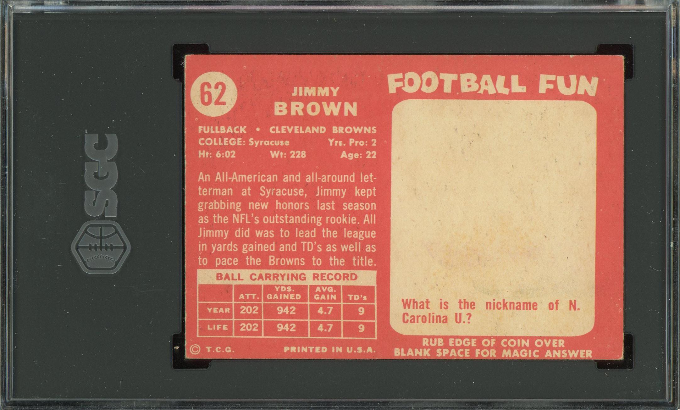 Jim Brown Cleveland Browns 1958 Topps Rookie Card #62. This card has been graded VG EX 4 by SGC.