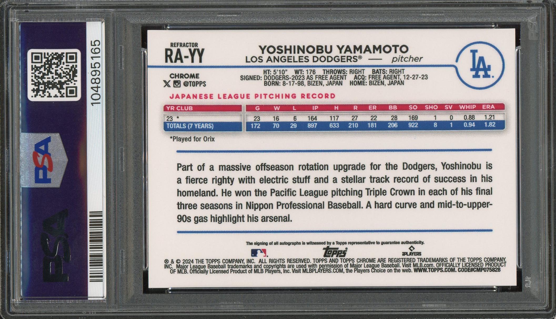 Yoshinobu Yamamoto 2024 Topps Chrome Refractor Rookie Autograph Card 476/499! PSA 9
