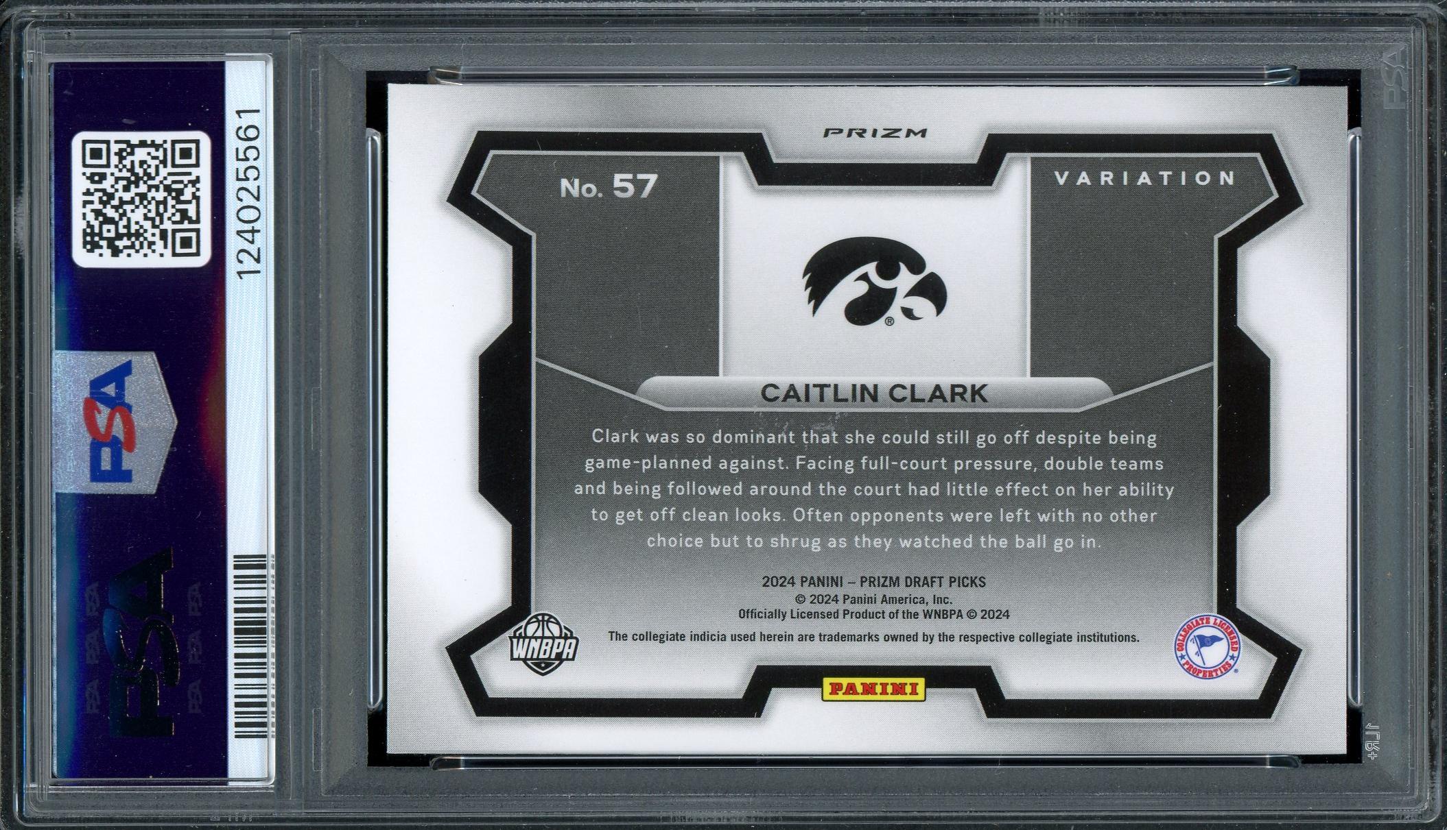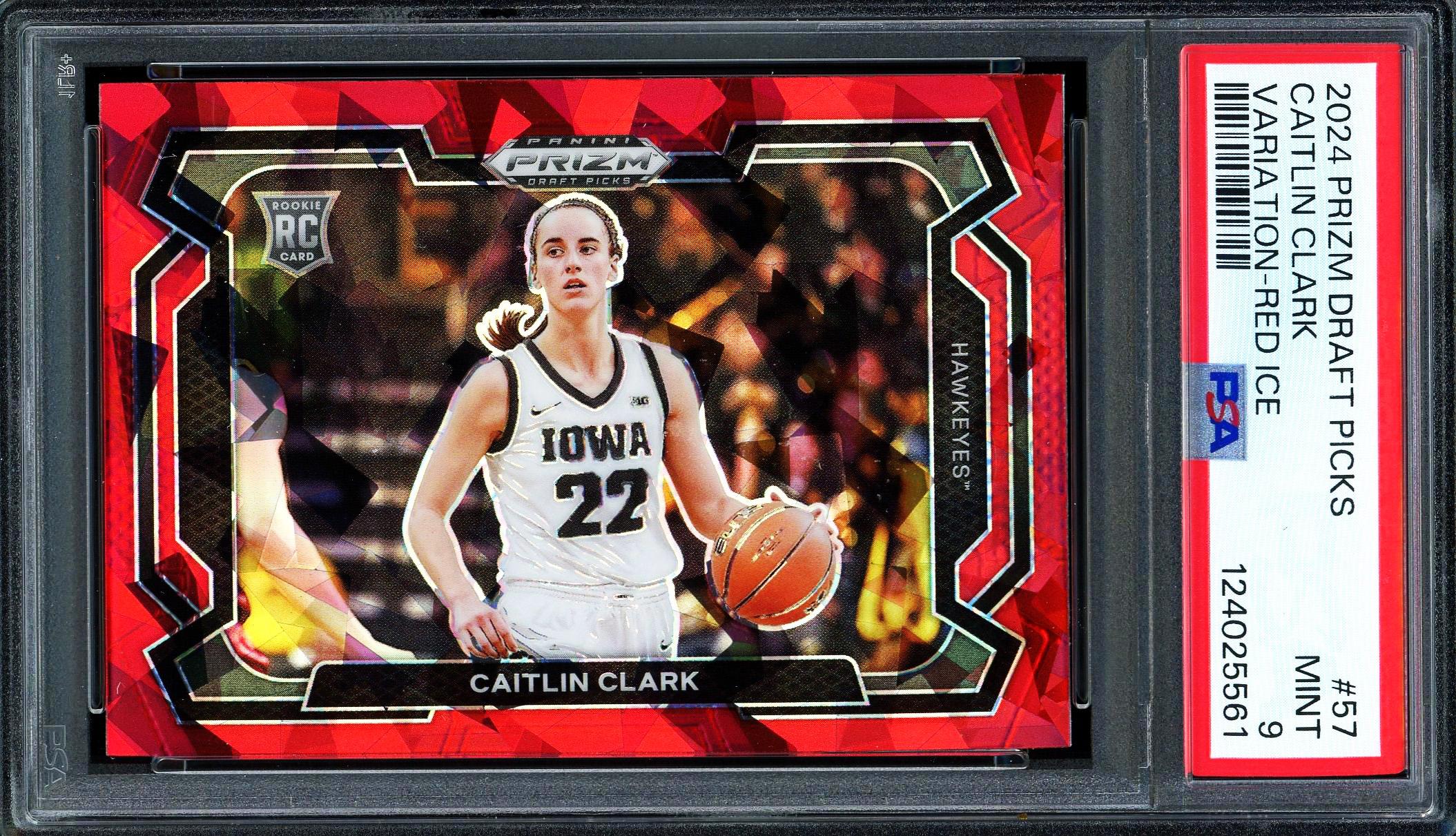 Caitlin Clark Iowa Hawkeyes 2024 Panini Prizm Draft Picks Variation Red Ice Rookie Card #57. This card has been graded Mint 9 by PSA (Professional Sports Authenticators).