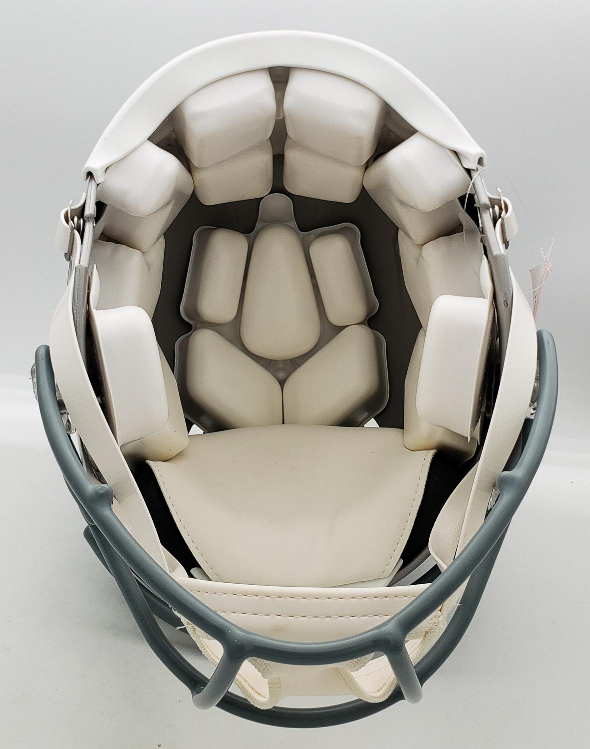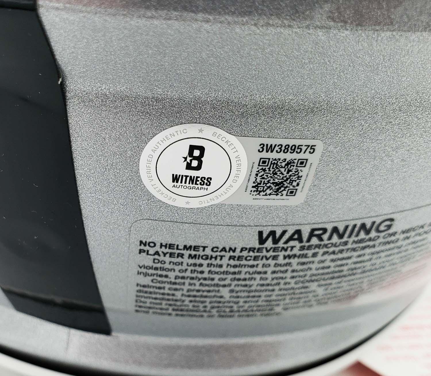 This autographed full size Riddell Authentic Speed helmet has been personally hand-signed by Brock Bowers of the Las Vegas Raiders. This autograph is certified by Beckett Authentication Services (BAS) Witness Certification. That means that a Beckett representative was present when this item was signed. It comes with the numbered authentication hologram with a QR code that verifies the authentication on the Beckett website.