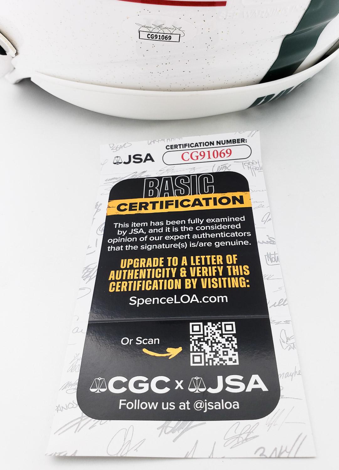 This autographed full size Riddell SpeedFlex authentic helmet has been personally hand-signed by Jordan Love of the Green Bay Packers. This autograph is certified by James Spence Authentication (JSA). It comes with the numbered hologram and matching Certificate of Authenticity.