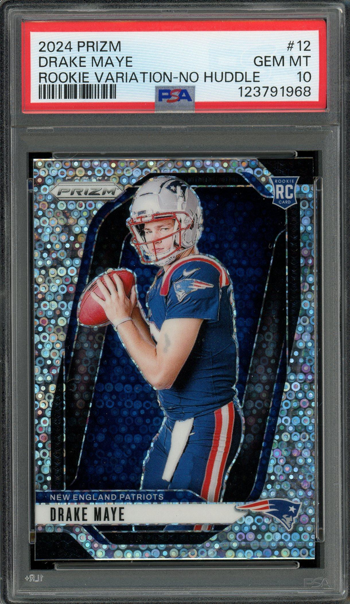 Drake Maye New England Patriots 2024 Panini Prizm Variation No Huddle Rookie Card #12. This card has been graded Gem Mint 10 by PSA (Professional Sports Authenticators).