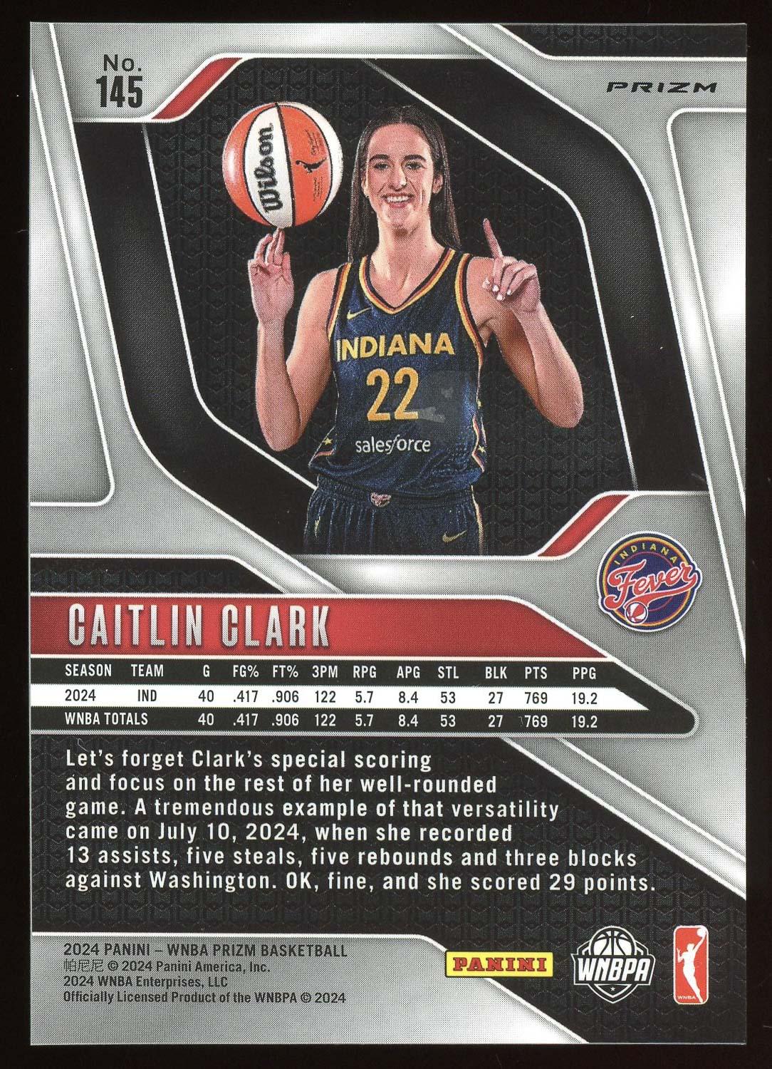 Caitlin Clark Indiana Fever 2024 Panini Prizm Green Rookie Card #145. Please see pictures for details on the condition of this card.