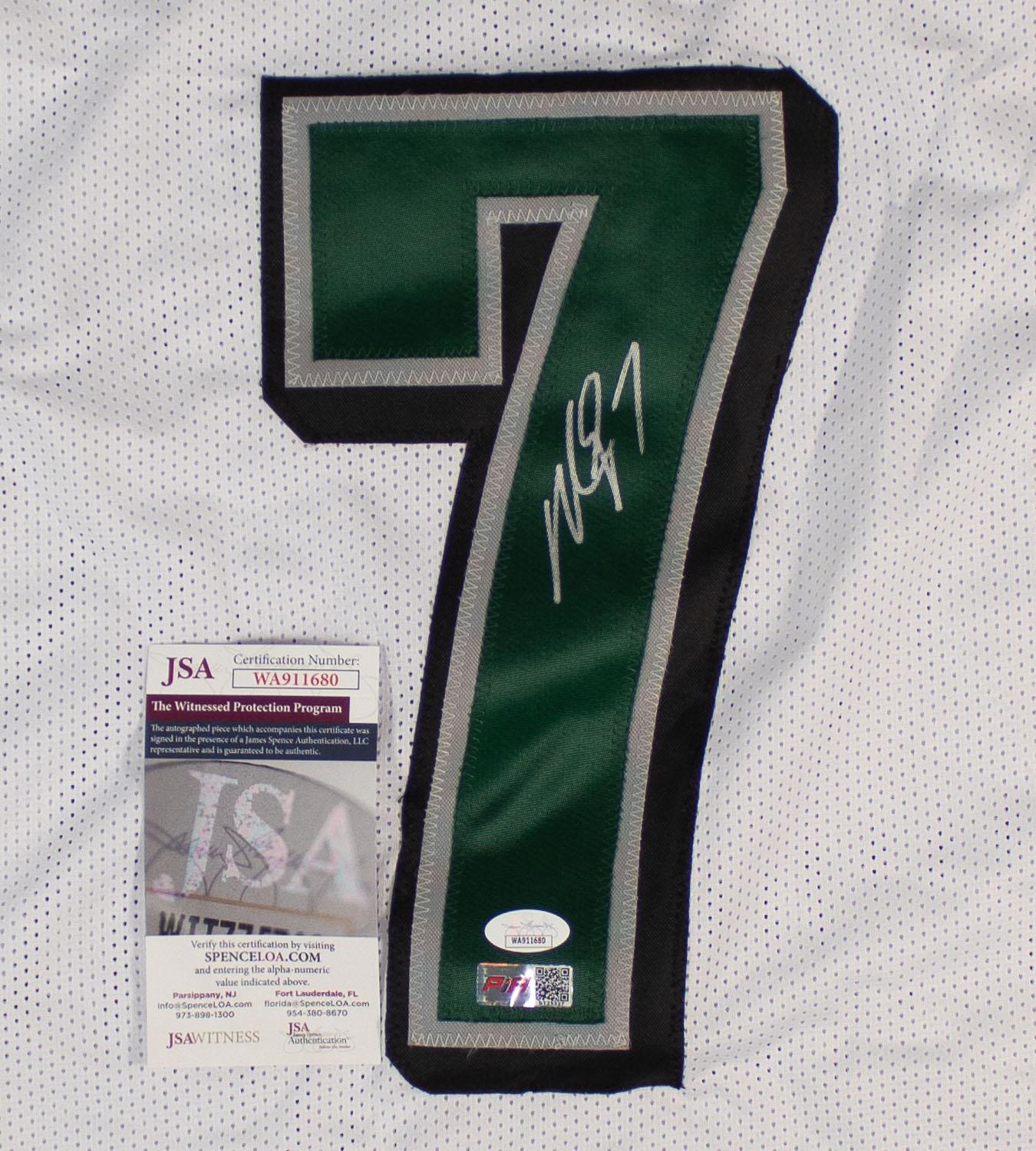 This autographed jersey has been personally hand-signed by Michael Vick of the Philadelphia Eagles. This autograph is certified by James Spence Authentication's (JSA) Witnessed Protection Program. That means that a JSA representative was present when this item was signed. It comes with the numbered hologram and matching Certificate of Authenticity.