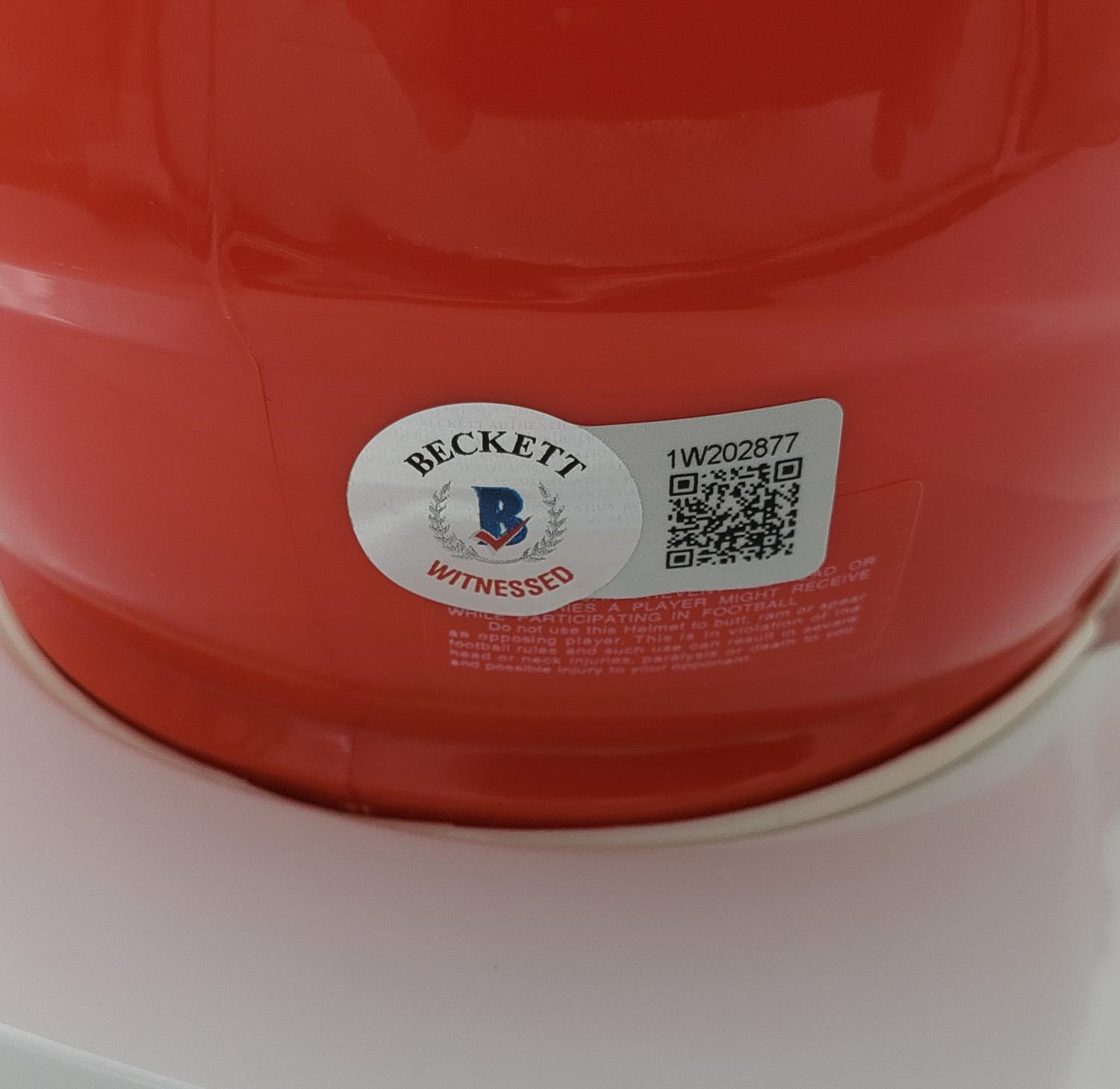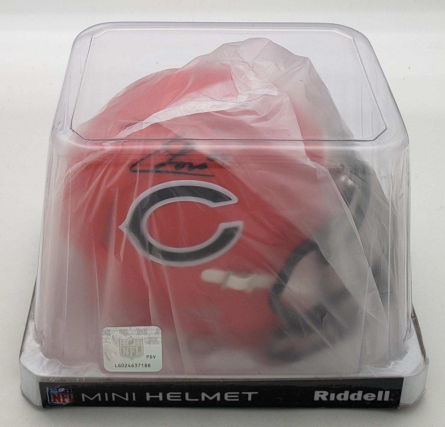 This autographed Riddell Speed mini helmet has been personally hand-signed by Colston Loveland of the Chicago Bears. This autograph is certified by Beckett Authentication Services (BAS) Witness Certification. That means that a Beckett representative was present when this item was signed. It comes with the numbered authentication hologram with a QR code that verifies the authentication on the Beckett website.