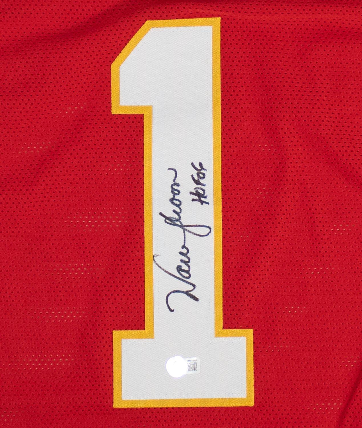 This autographed jersey has been personally hand-signed by Warren Moon("HOF 06" inscription) of the Kansas City Chiefs. This autograph is certified by Beckett Authentication Services (BAS) Witness Certification. That means that a Beckett representative was present when this item was signed. It comes with the numbered authentication hologram with a QR code that verifies the authentication on the Beckett website.