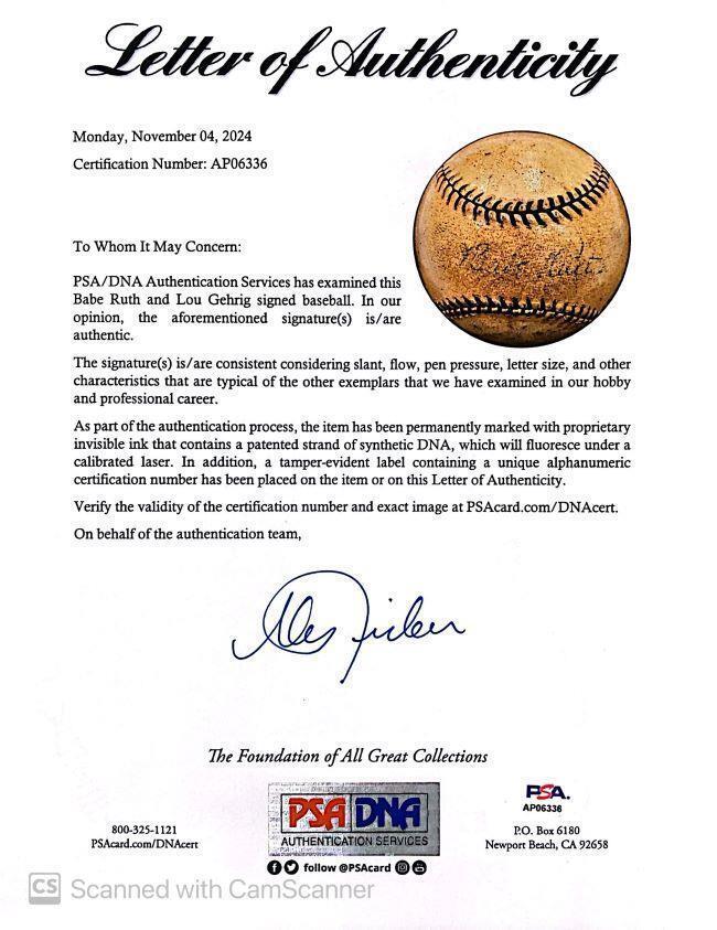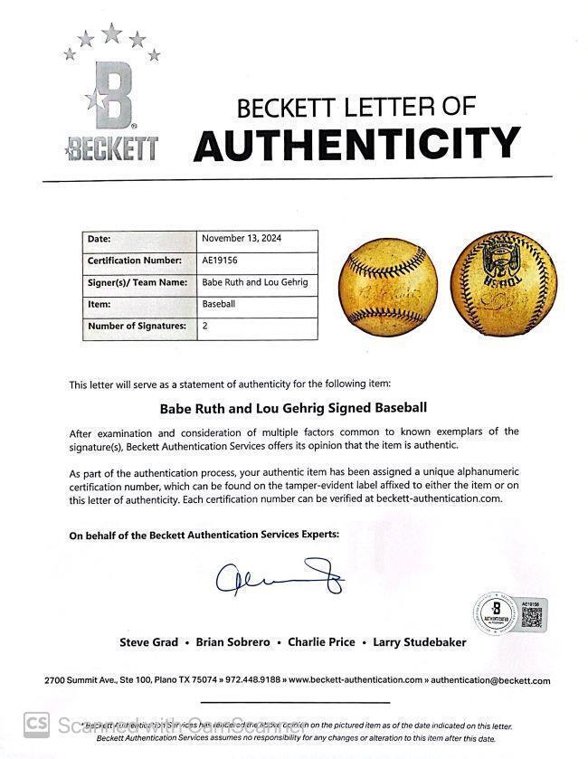 Babe Ruth & Lou Gehrig signed Suburban League baseball. This ball has been hand signed by Ruth and Gehrig and comes with the Beckett & PSA letters of authenticity. This item will be shipped from an approved vendors location.