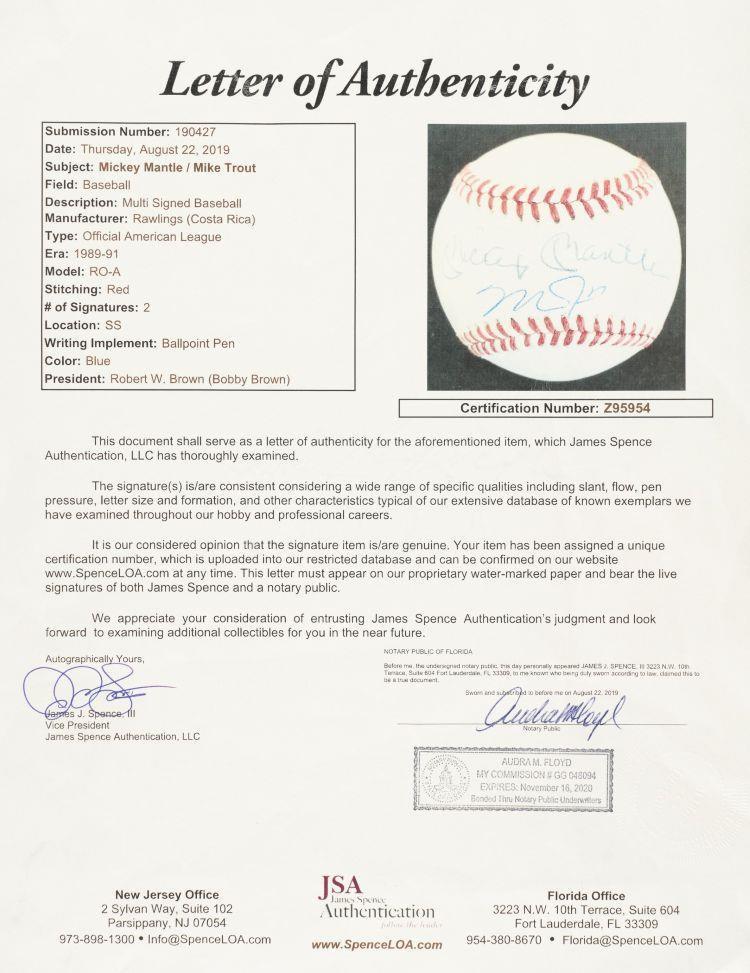 Mickey Mantle and Mike Trout signed official American League baseball. This ball has been hand signed by Mantle and Trout and comes with the JSA hologram and letter of authenticity. The Trout autograph is also authenticated by MLB and comes with the numbered hologram which can be verified on the MLB.com website. This item will be shipped from an approved vendors location.