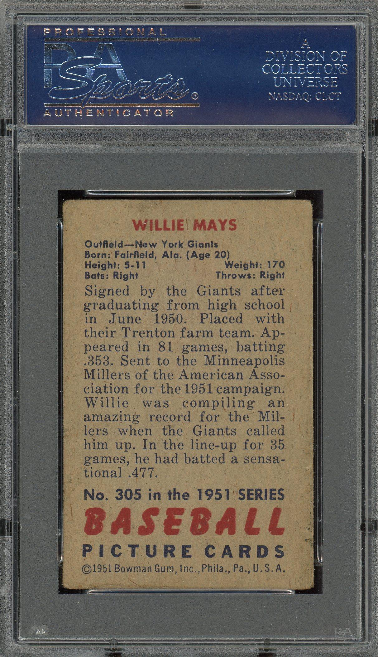 Willie Mays New York Giants 1951 Bowman Rookie Card #305. This card has been graded GD 2 by PSA (Professional Sports Authenticators).