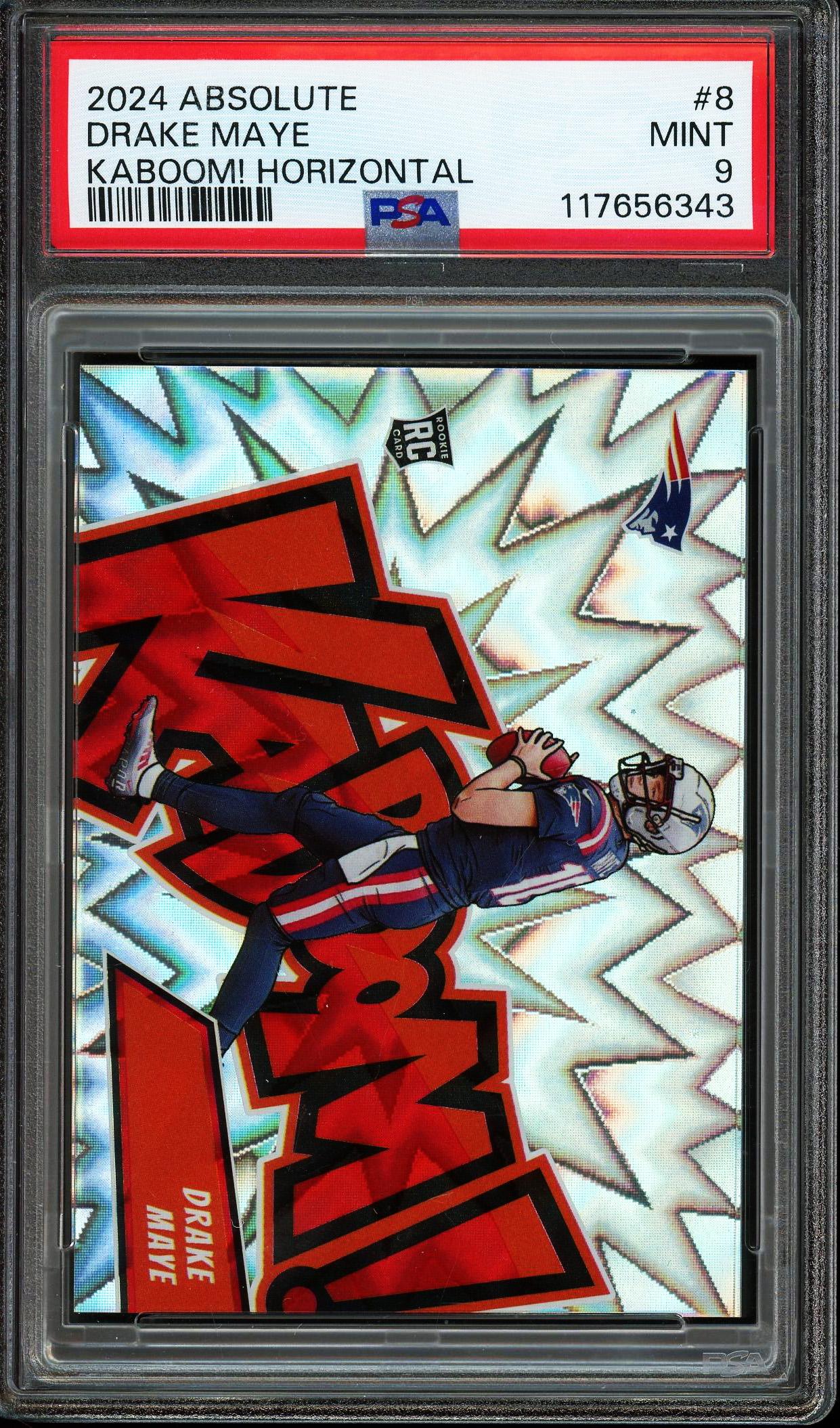 Drake Maye New England Patriots 2024 Panini Absolute Kaboom Horizontal Rookie Card #8. This card has been graded Mint 9 by PSA (Professional Sports Authenticators).
