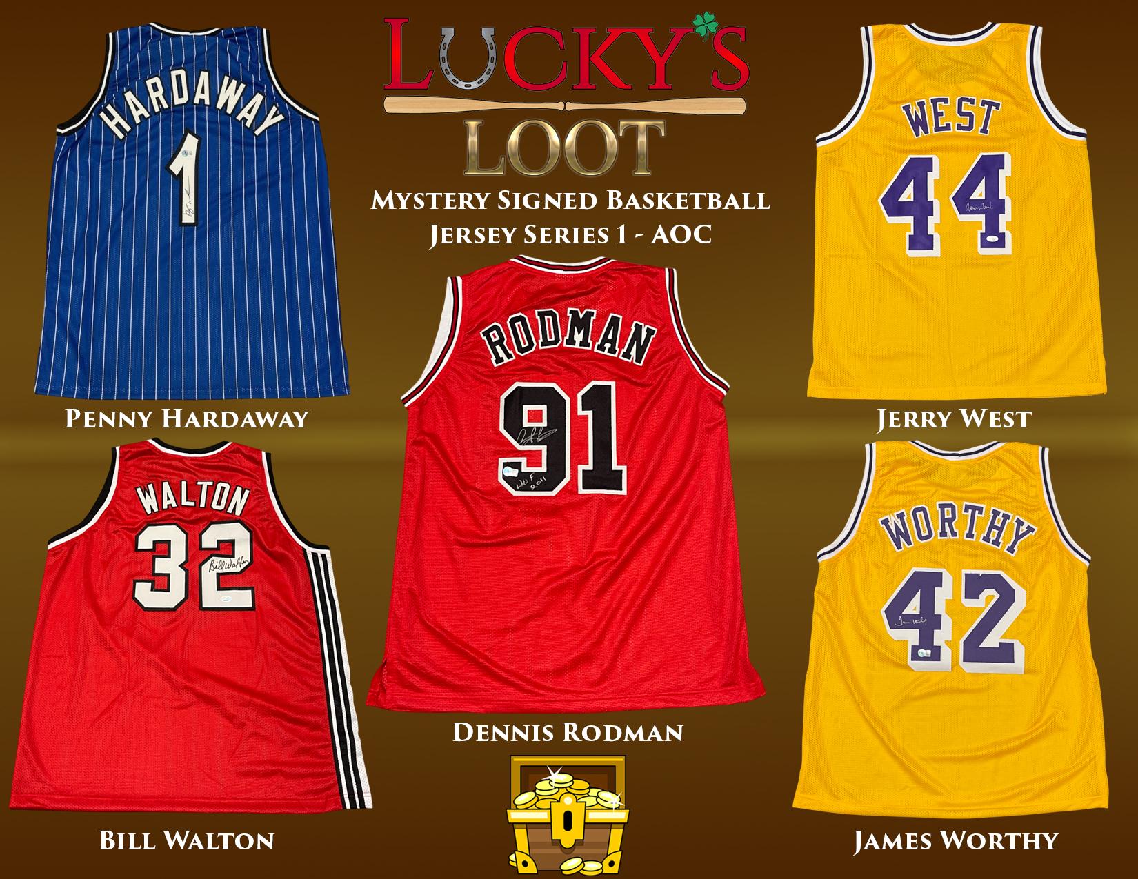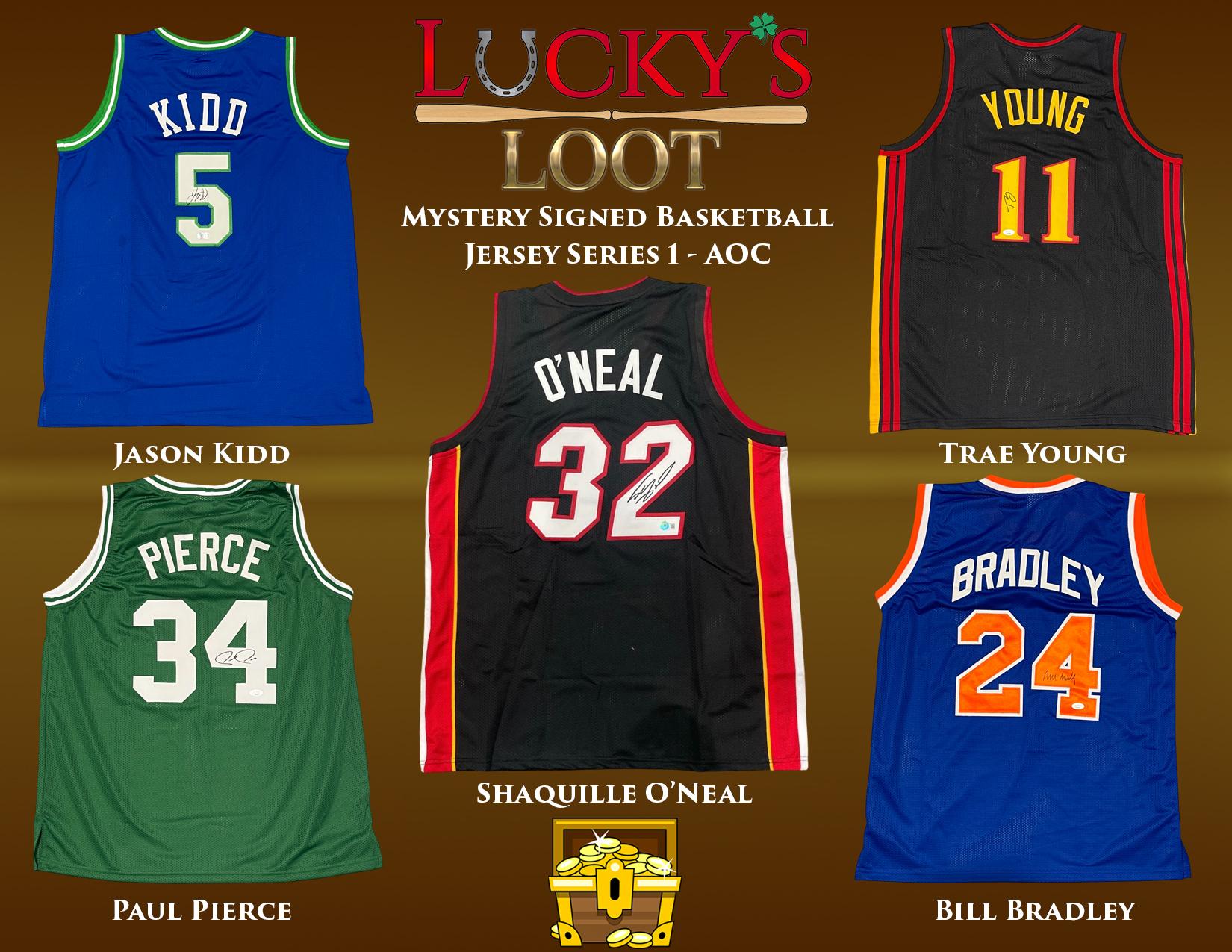 Lucky's Loot Mystery Signed Basketball Jerseys Series 1 includes one Autographed Jersey in Every Pack. There are over 70 different Current and Former Basketball Players included in this series, which is an Auction of Champions Exclusive Edition that is limited to 500 total packs. MORE THAN 215 Packs contain an Inscribed Jersey (i.e. HOF 2020, 5x All-Star, etc.) Players included in this Series include: Steph Curry (Swingman), Nikola Jokic, Larry Bird, Giannis Antetokounmpo, Julius Dr. J Erving, Kevin Garnett (Mitchell & Ness), Steve Nash, Ja Morant, Allen Iverson, Damian Lillard, Shaquille ONeal, Jason Kidd, Trae Young, Paul Pierce, Bill Bradley, Dennis Rodman, Anfernee Penny Hardaway, Jerry West, Bill Walton, James Worthy, Chauncey Billups, Domantas Sabonis, George Gervin, Jalen Green, Alonzo Mourning, David Thompson, Stephon Marbury, Austin Reaves, Jrue Holliday, Gary Payton, Christian Laettner, Chris Mullin, Dominique Wilkins, Franz Wagner, Joe Dumars. Also Included: Ron Artest, Dave Bing, Otis Birdsong, Muggsy Bogues, Dee Brown, Derrick Coleman, Terry Cummings, Bob Dandridge, Adrian Dantley, Donte DiVincenzo, Steve Francis, Artis Gilmore, Gail Goodrich, Derrick Harper, Udonis Haslem, Elvin Hayes, Robert Horry, Allan Houston, Dan Issel, Larry Johnson, Shawn Kemp, Bernard King, Toni Kukoc, Cedric Maxwell, Xavier McDaniel, Greg Oden, Sam Perkins, Glen Rice, Micheal Ray Richardson, Tom Satch Sanders, Charlie Scott, Jack Sikma, Joe Smith, Latrell Sprewell, Amare Stoudemire & Antoine Walker.