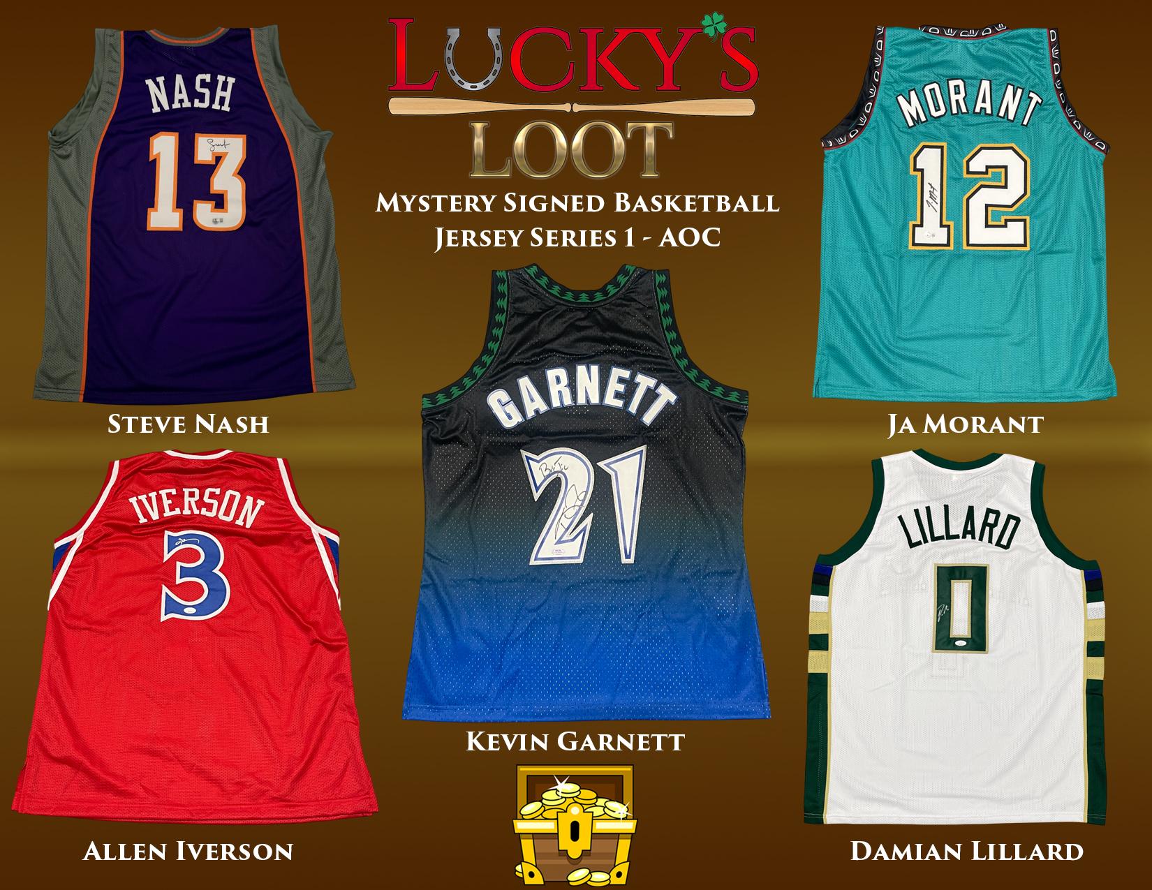 Lucky's Loot Signed NBA Custom Jersey Mystery Pack Series 1 : Look for Curry (Swingman), Jokic, Bird, Giannis, Dr. J, Garnett (M&N), Nash, Morant, Iverson & much more!
