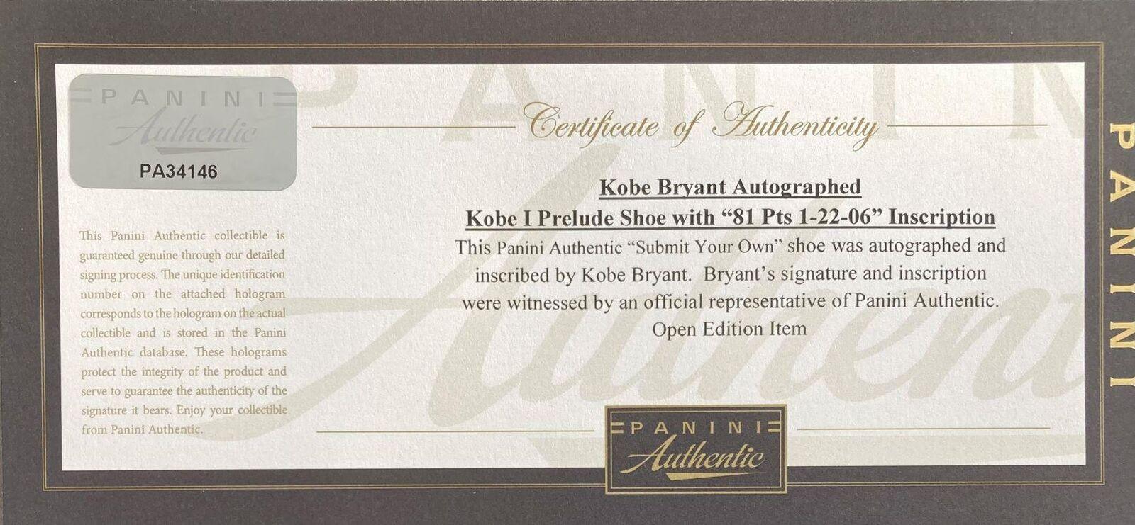 Kobe Bryant signed pair of Nike Zoom Kobe I Prelude shoes, with the rare "81 PTS 1-22-06" inscription. These shoes have been hand signed by Bryant and come with the Panini hologram and certificate of authenticity. The Kobe I Prelude shoes commemorate Bryant's 81 point game. These shoes are size 10. This item will be shipped from an approved vendors location.