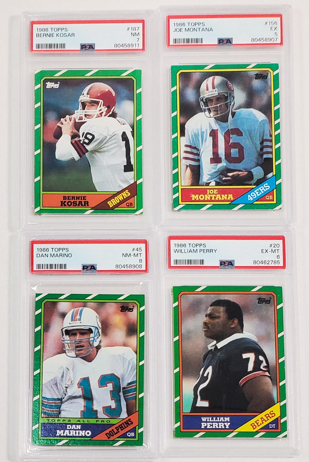 Lot of (4) PSA Graded 1986 Topps Cards w/Dan Marino & Joe Montana. Each card has been encapsulated and graded by PSA (Professional Sports Authenticators).