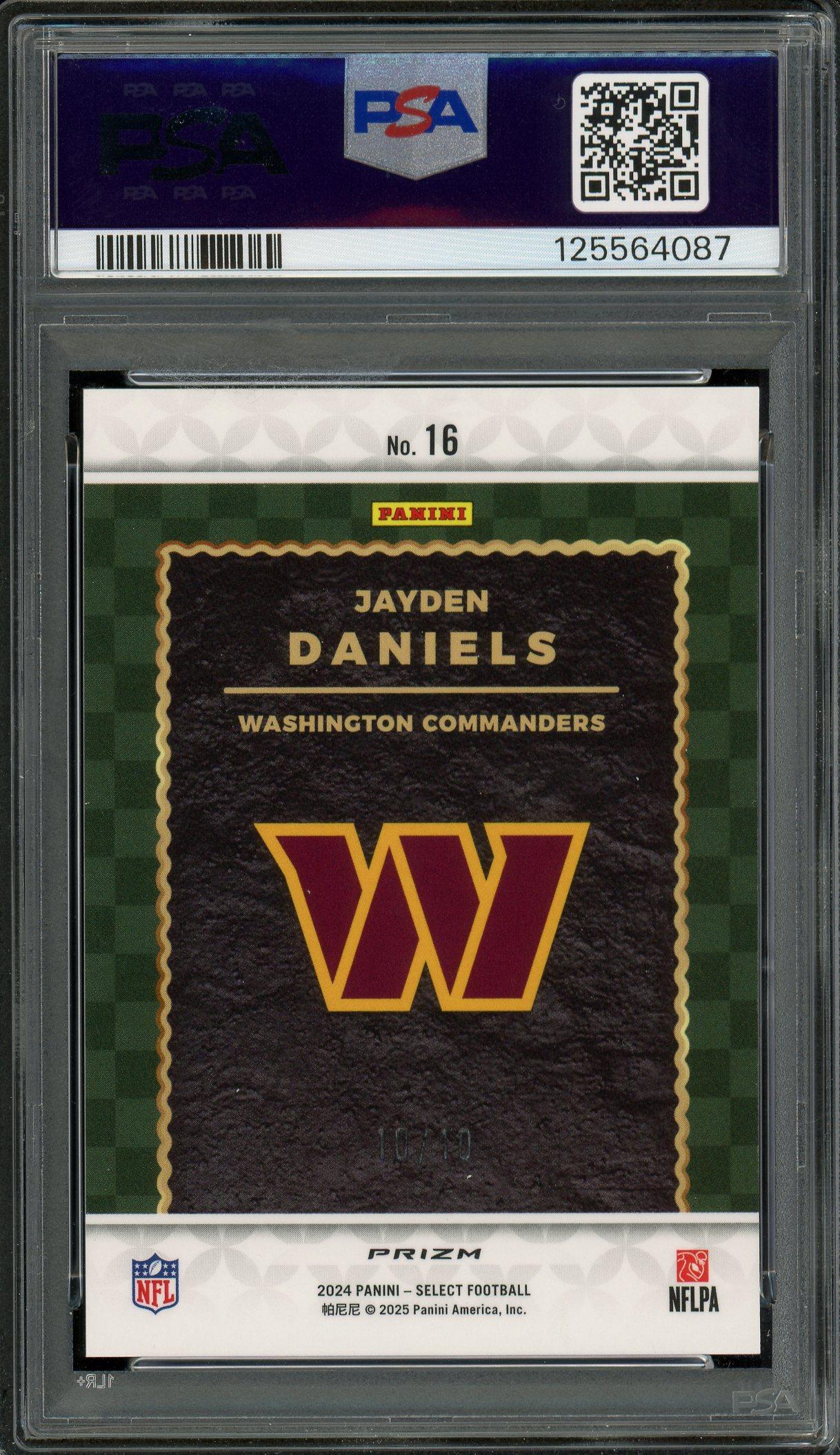 Jayden Daniels Washington Commanders 2024 Panini Select Score Select TB Gold Prizm Card 10/10! This card has been graded Mint 9: POP 2, 3 Higher by PSA (Professional Sports Authenticators)!