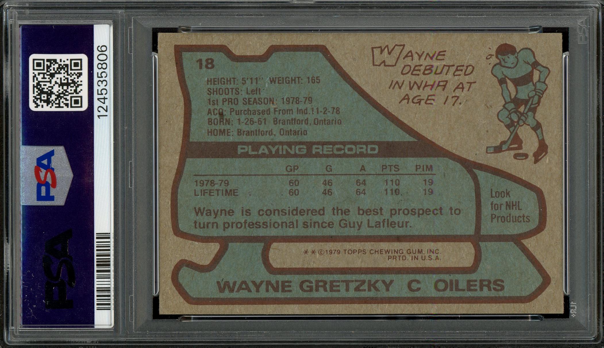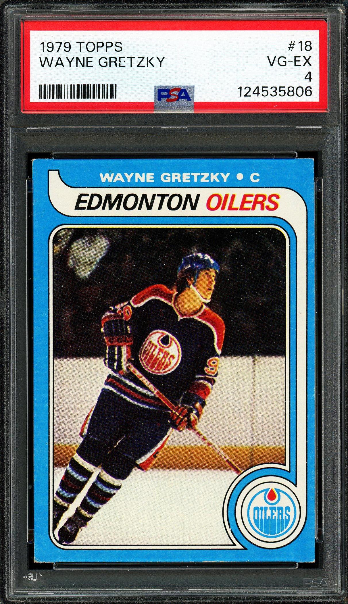 Wayne Gretzky Edmonton Oilers 1979 Topps Rookie Card #18. This card has been graded VG EX 4 by PSA (Professional Sports Authenticators).