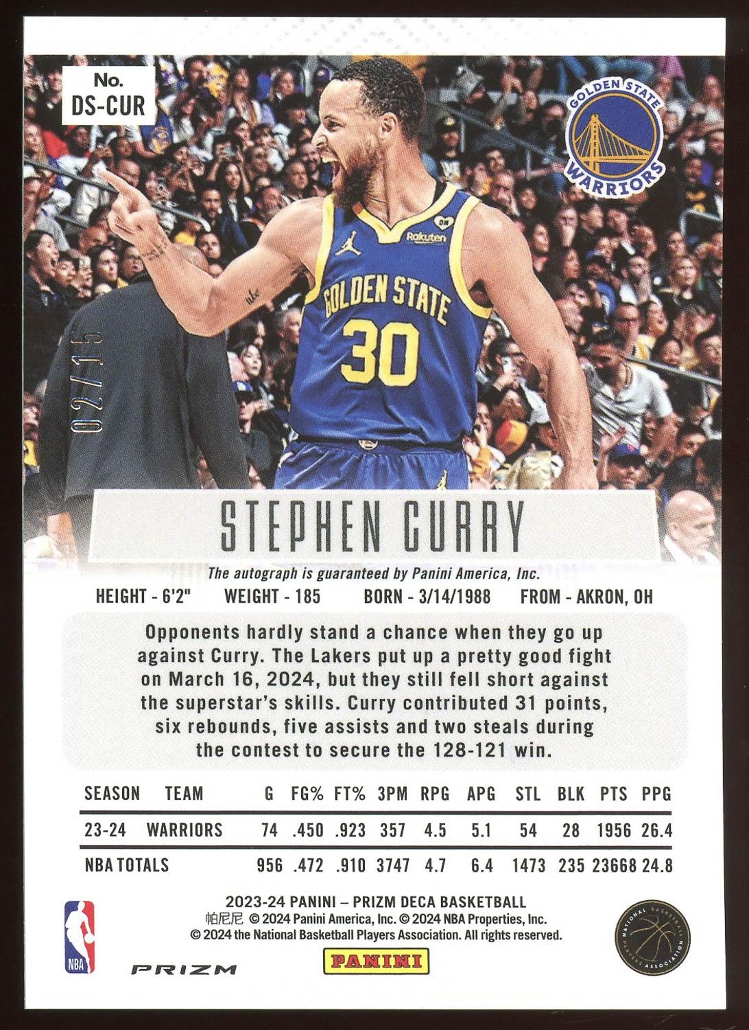 Stephen Curry 2023 Panini Prizm Deca Autograph Card 2/15!