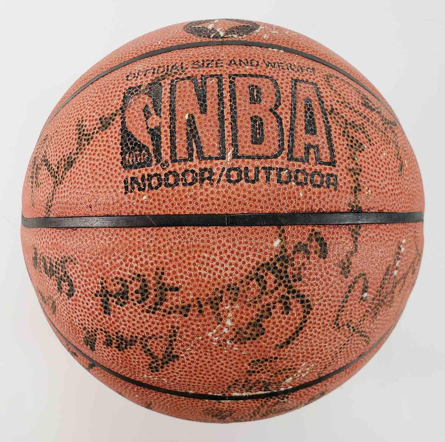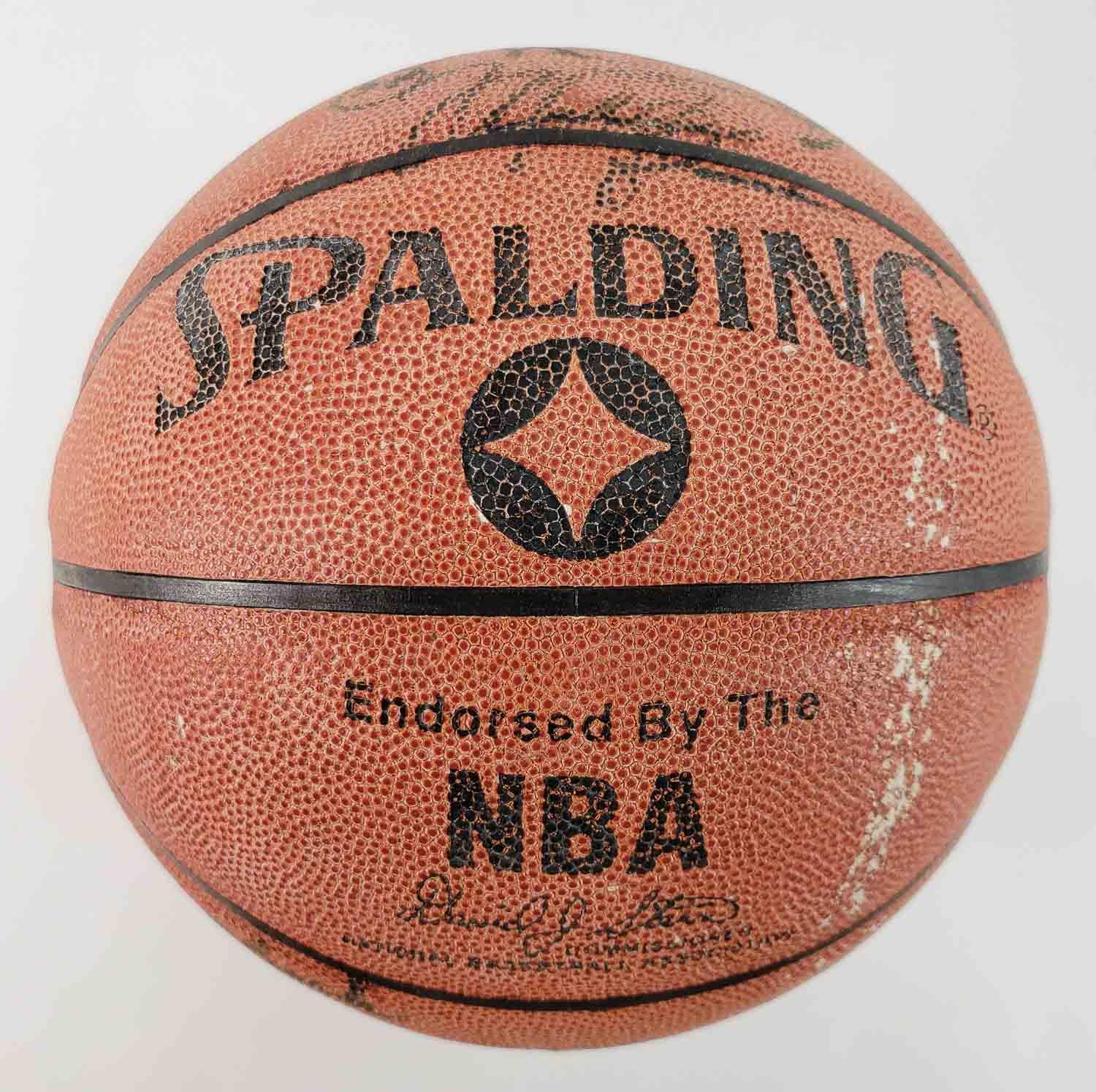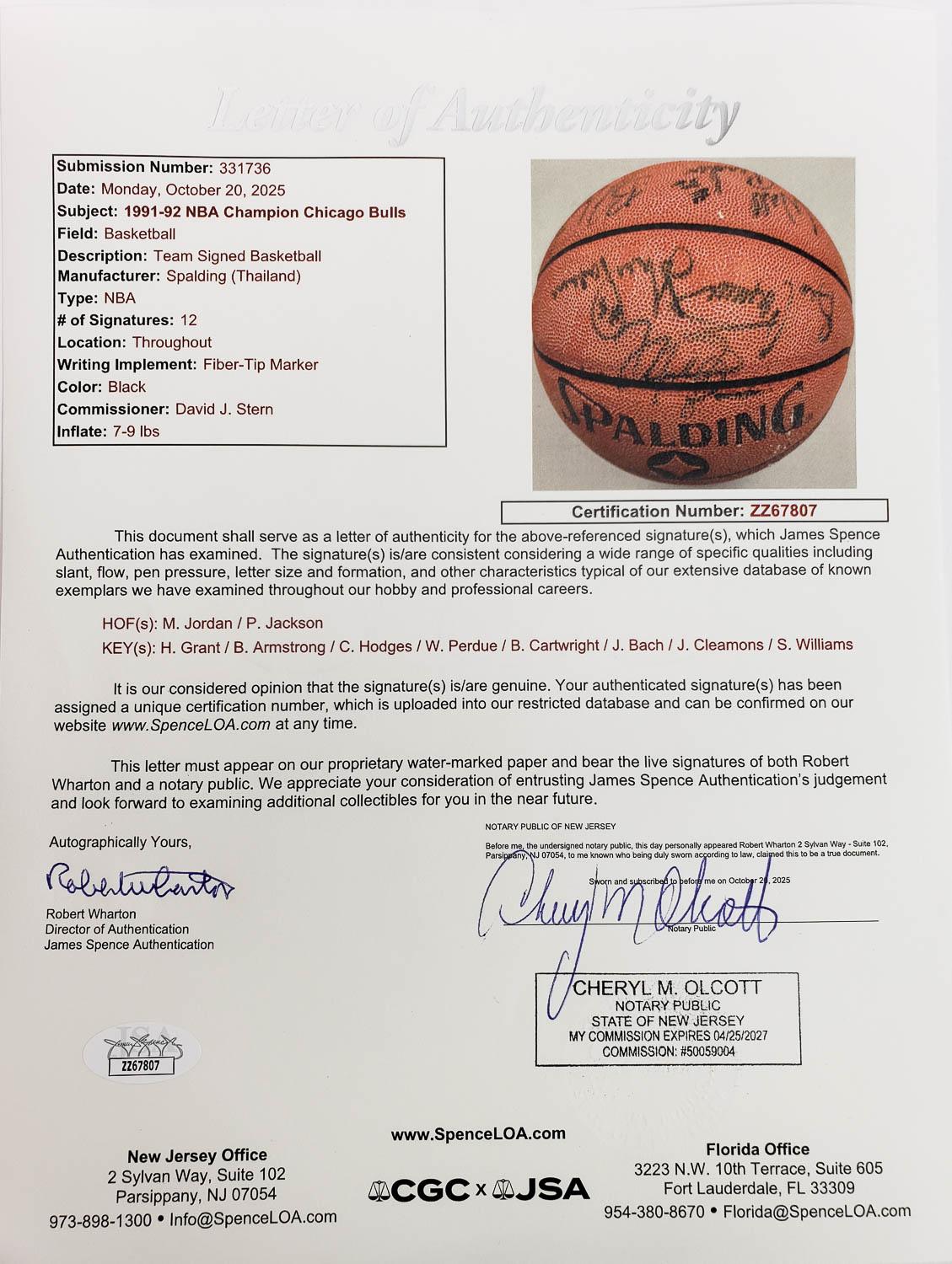 This autographed Spalding Indoor/Outdoor Basketball has been personally hand-signed by 12 members of the 1991-92 Chicago Bulls NBA Championship Team. Signature include; Michael Jordan, Phil Jackson (head coach), Horace Grant, BJ Armstrong, Craig Hodges, Will Perdue, Bill Cartwright, Johnny Bach (assisitant coach), Jim Cleamons (assistant coach) & Scott Williams. These autographs are certified by James Spence Authentication (JSA). It comes with the numbered hologram and matching Letter of Authenticity. Please see all pictures for the condition of the ball and signatures. The ball shows heavy signs of aging with cracking.