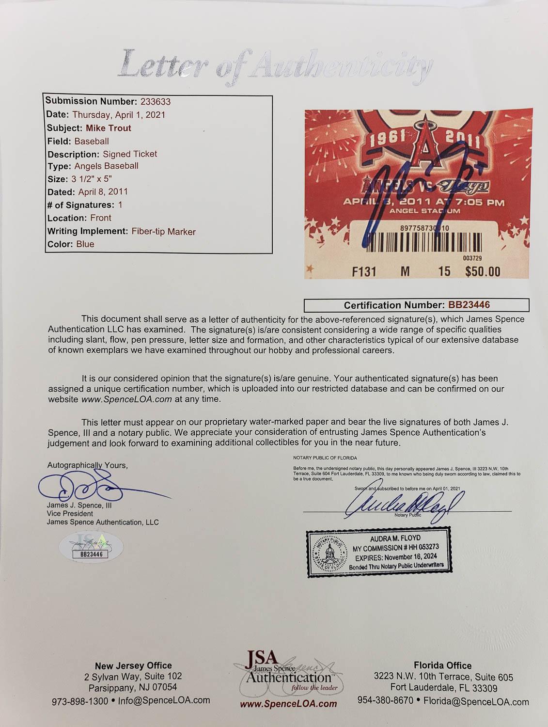 This autographed ticket has been personally hand-signed by Mike Trout of the Los Angeles Angels. Trout did not get called up until later in the season so this is not his MLB debut ticket but it is the ticket to the Angels home opener for the 2011 season which was his first year in the league. This autograph is certified by James Spence Authentication (JSA). It comes with the numbered hologram and matching Letter of Authenticity.