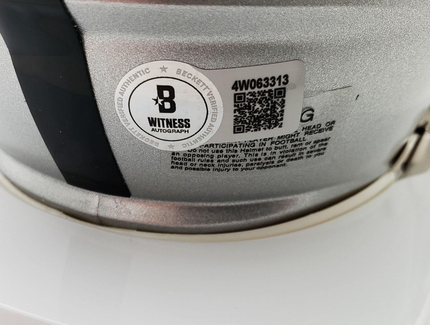 This autographed Riddell Speed mini helmet has been personally hand-signed by Howie Long of the Oakland Raiders. This autograph is certified by Beckett Authentication Services (BAS) Witness Certification. That means that a Beckett representative was present when this item was signed. It comes with the numbered authentication hologram with a QR code that verifies the authentication on the Beckett website.