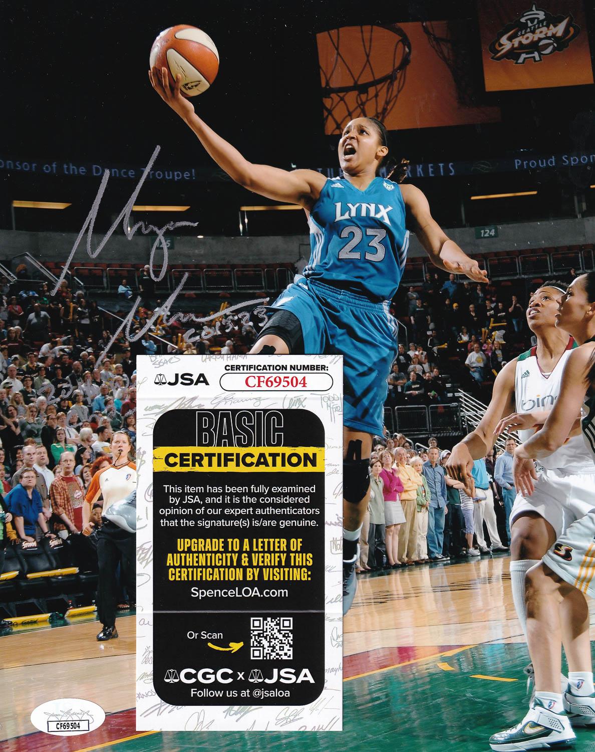 This autographed 8x10 photo has been personally hand-signed by Maya Moore of the Minnesota Lynx. This autograph is certified by James Spence Authentication (JSA). It comes with the numbered hologram and matching Certificate of Authenticity.