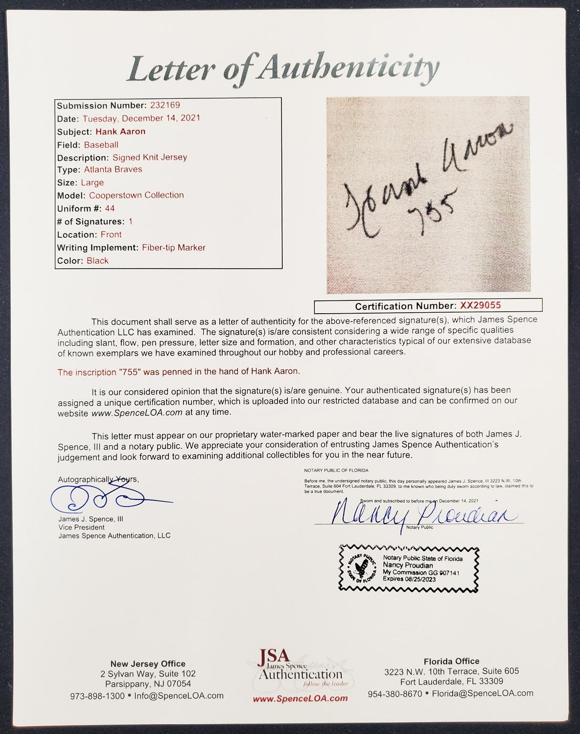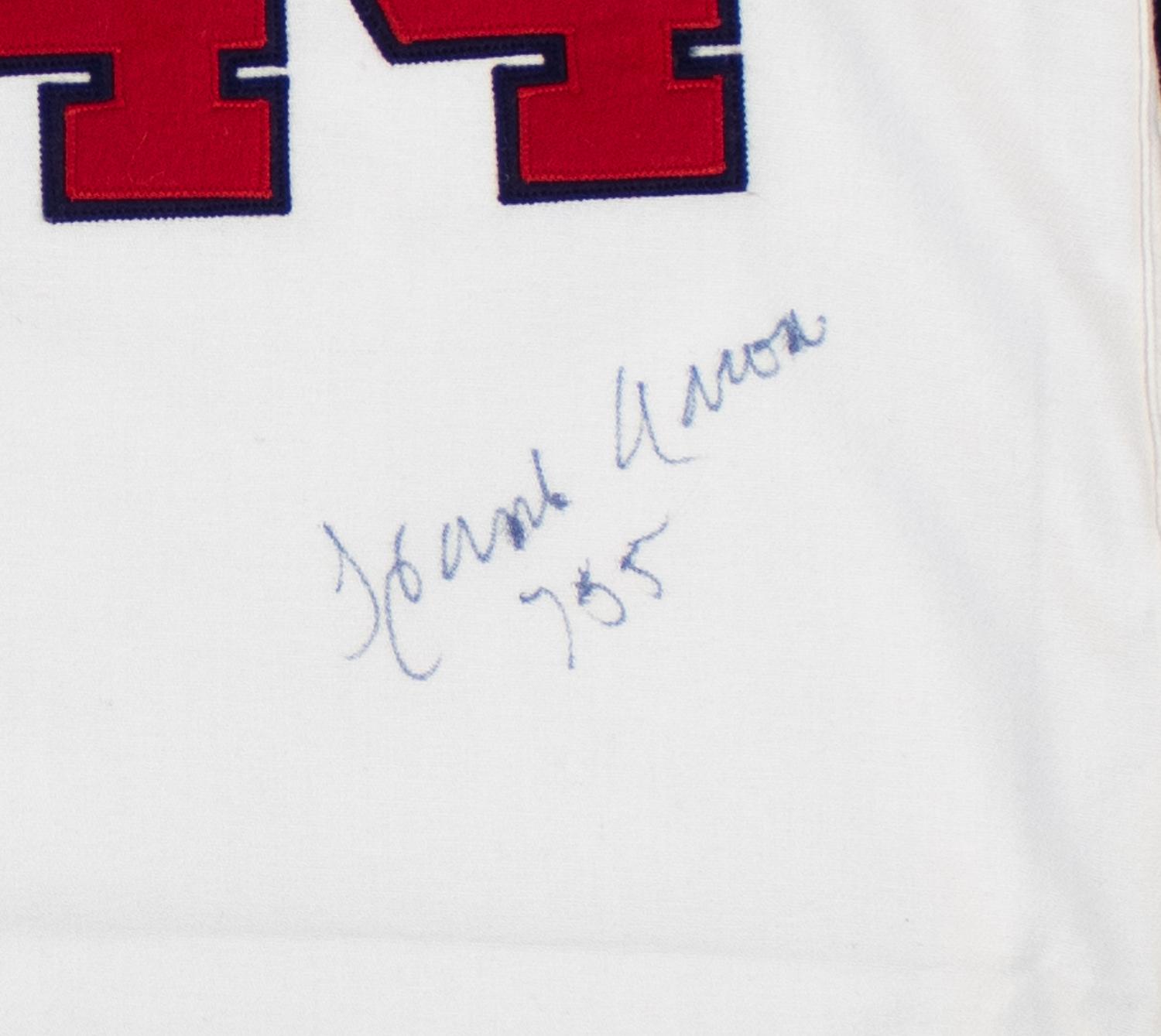 This autographed jersey has been personally hand-signed by Hank Aaron "755" of the Milwaukee Braves. This autograph is certified by James Spence Authentication (JSA). It comes with the numbered hologram and matching Letter of Authenticity.