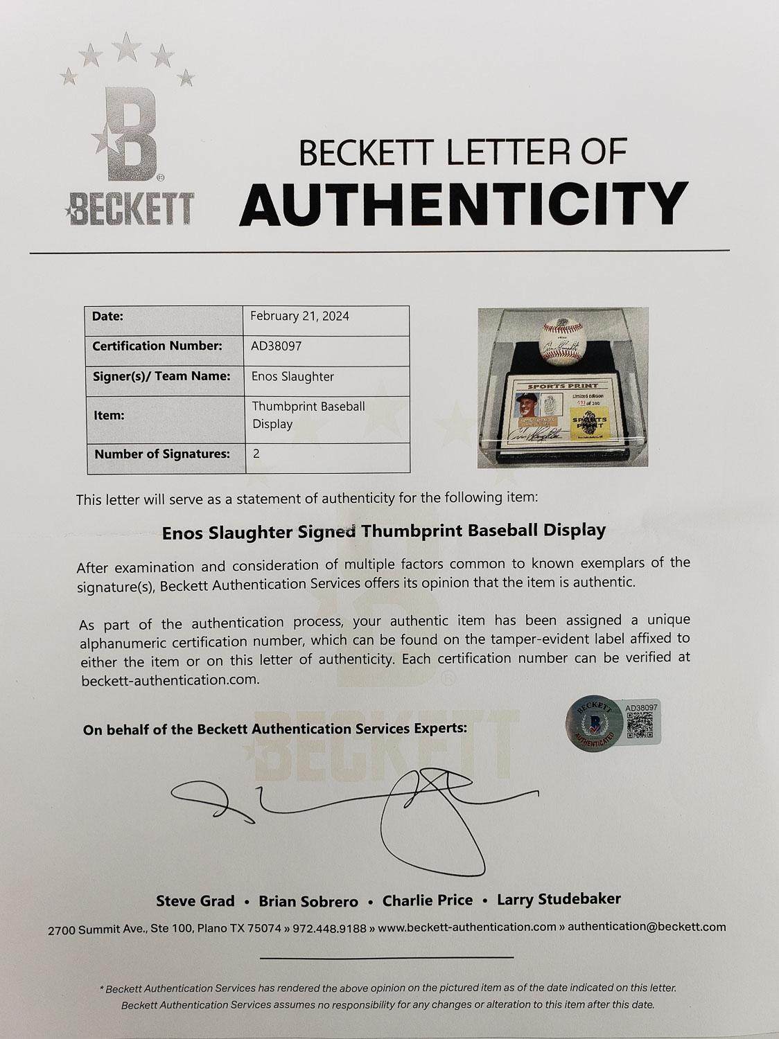 Enos Slaughter Signed Thumbprint Baseball in a Limited Edition #'d/200 Display w/Signed COA (Beckett LOA)