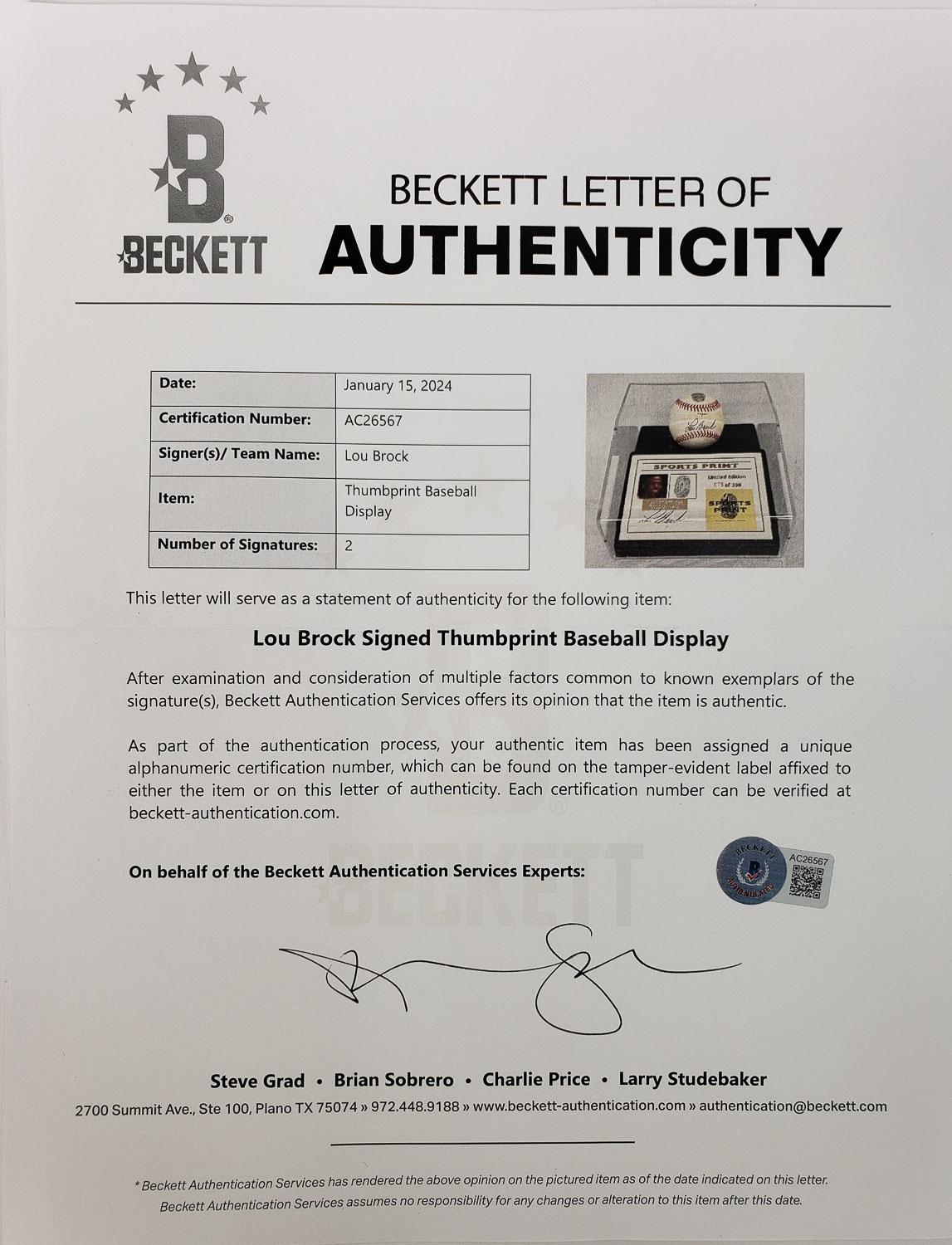 Lou Brock Signed Thumbprint Baseball in a Limited Edition #'d/200 Display w/Signed COA (Beckett LOA)