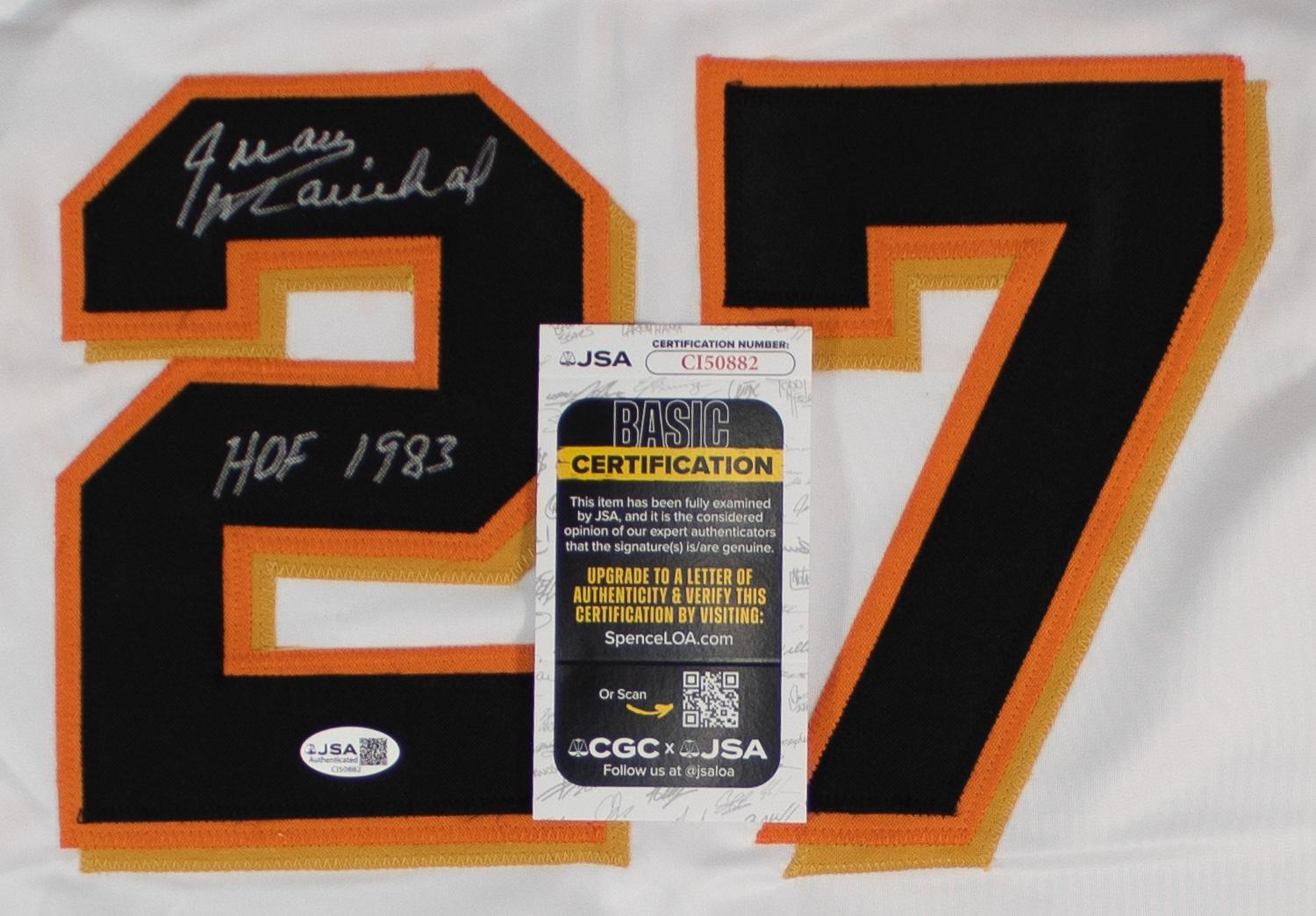 This autographed jersey has been personally hand-signed by Juan Marichal("HOF 1983" inscription) of the San Francisco Giants. This autograph is certified by James Spence Authentication's (JSA) Witnessed Protection Program. That means that a JSA representative was present when this item was signed. It comes with the numbered authentication hologram with a QR code that verifies the authentication on the JSA website.