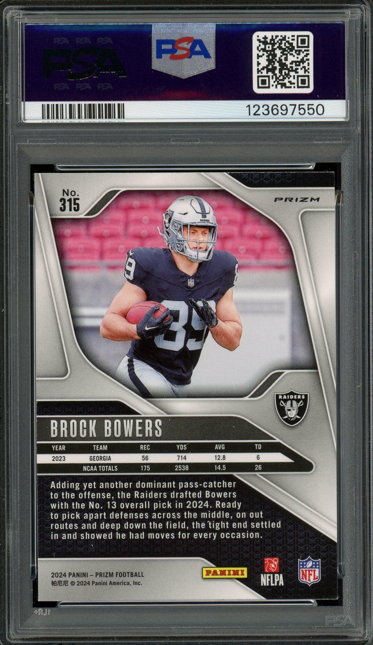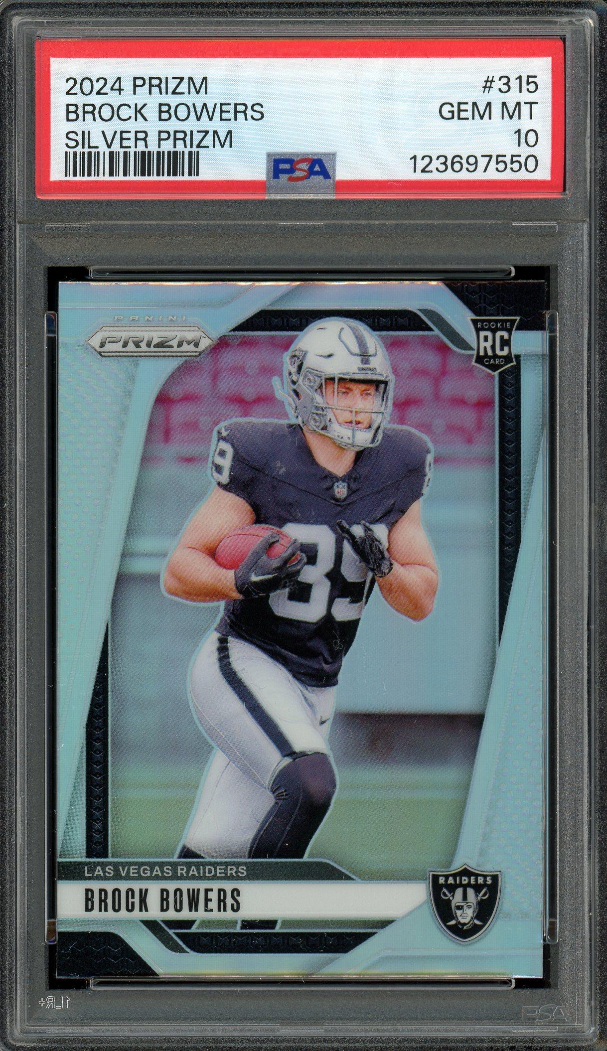 Brock Bowers Las Vegas Raiders 2024 Panini Prizm Silver Prizm Rookie Card #315. This card has been graded Gem Mint 10 by PSA (Professional Sports Authenticators)!