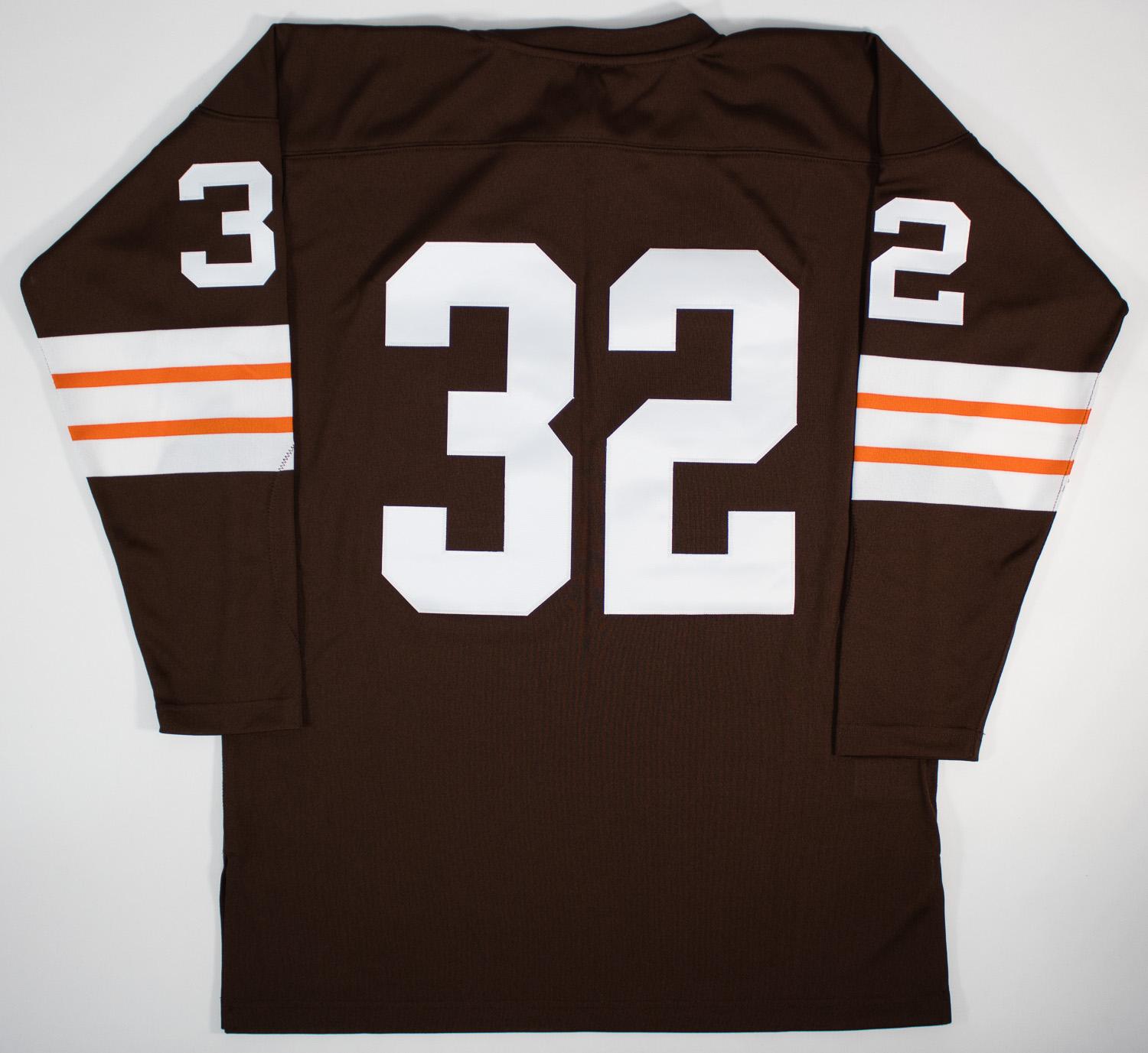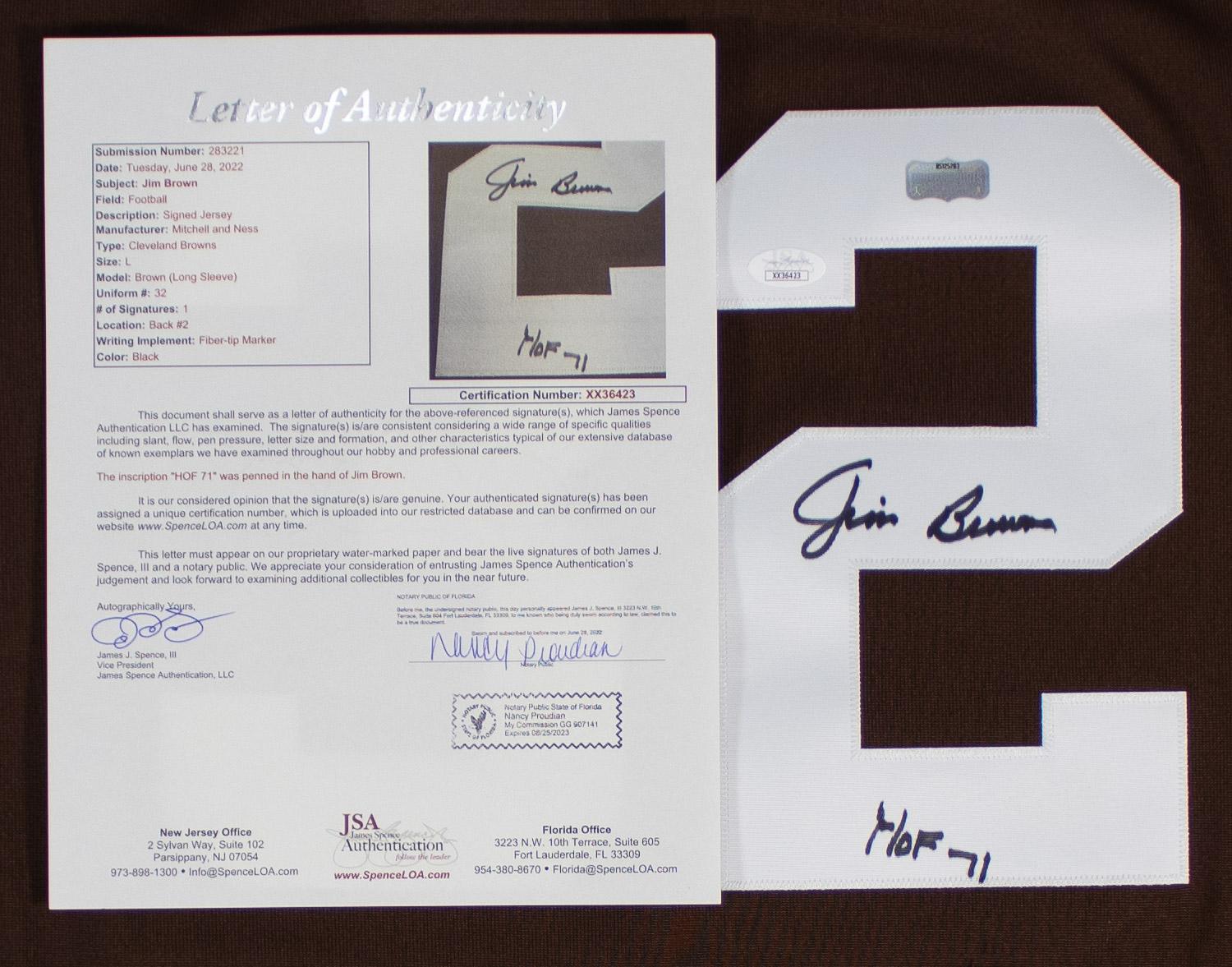 This autographed Mitchell & Ness jersey has been personally hand-signed by Jim Brown ("HOF 71" inscription) of the Cleveland Browns. This autograph is certified by James Spence Authentication (JSA). It comes with the numbered hologram and matching Letter of Authenticity.