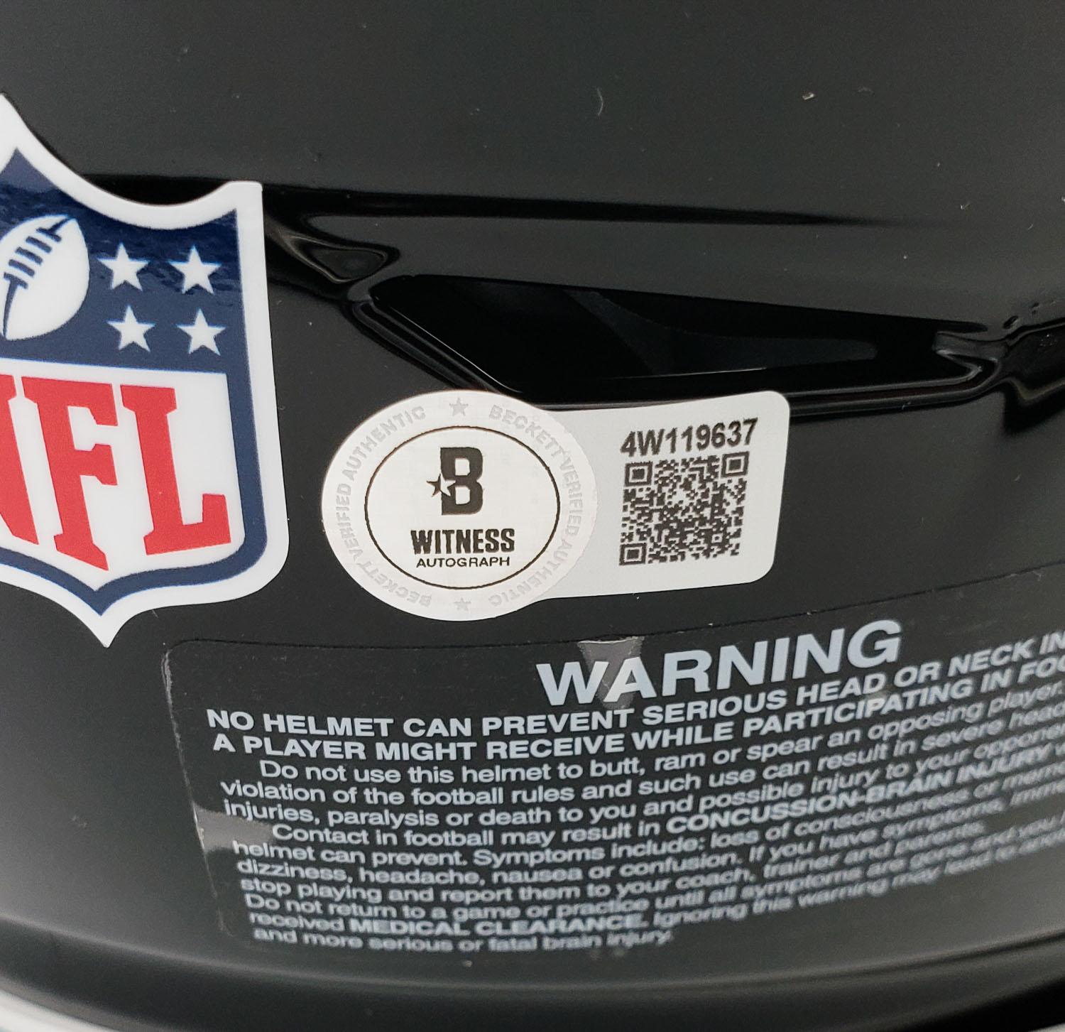 This autographed full size Riddell SpeedFlex authentic speed helmet has been personally hand-signed by Travis Hunter of the Jacksonville Jaguars. This autograph is certified by Beckett Authentication Services (BAS) Witness Certification. That means that a Beckett representative was present when this item was signed. It comes with the numbered authentication hologram with a QR code that verifies the authentication on the Beckett website.