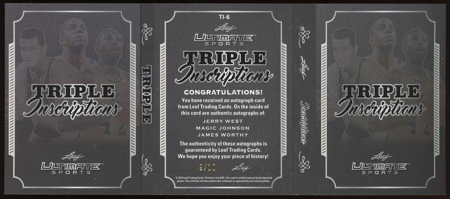 Jerry West, Magic Johnson & James Worthy 2024 Leaf Triple Inscriptions Autograph Booklet Card 9/10! Please see pictures for details on the condition of these cards.