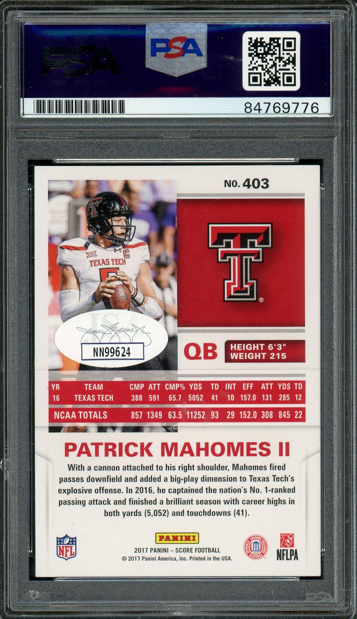 Patrick Mahomes II Signed 2017 Panini Score Rookie Card #403 PSA/DNA w/JSA