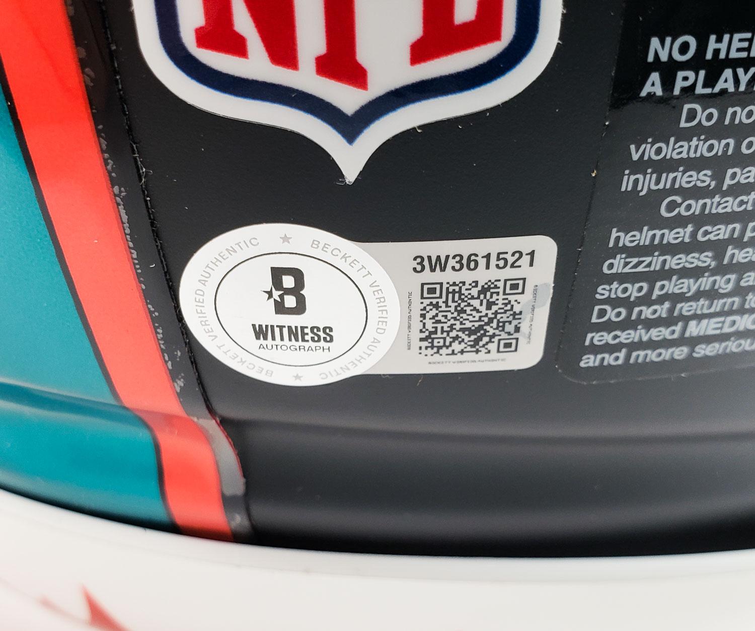 This autographed full size Riddell SpeedFlex authentic speed helmet has been personally hand-signed by Dan Marino of the Miami Dolphins. This autograph is certified by Beckett Authentication Services (BAS) Witness Certification. That means that a Beckett representative was present when this item was signed. It comes with the numbered authentication hologram with a QR code that verifies the authentication on the Beckett website.