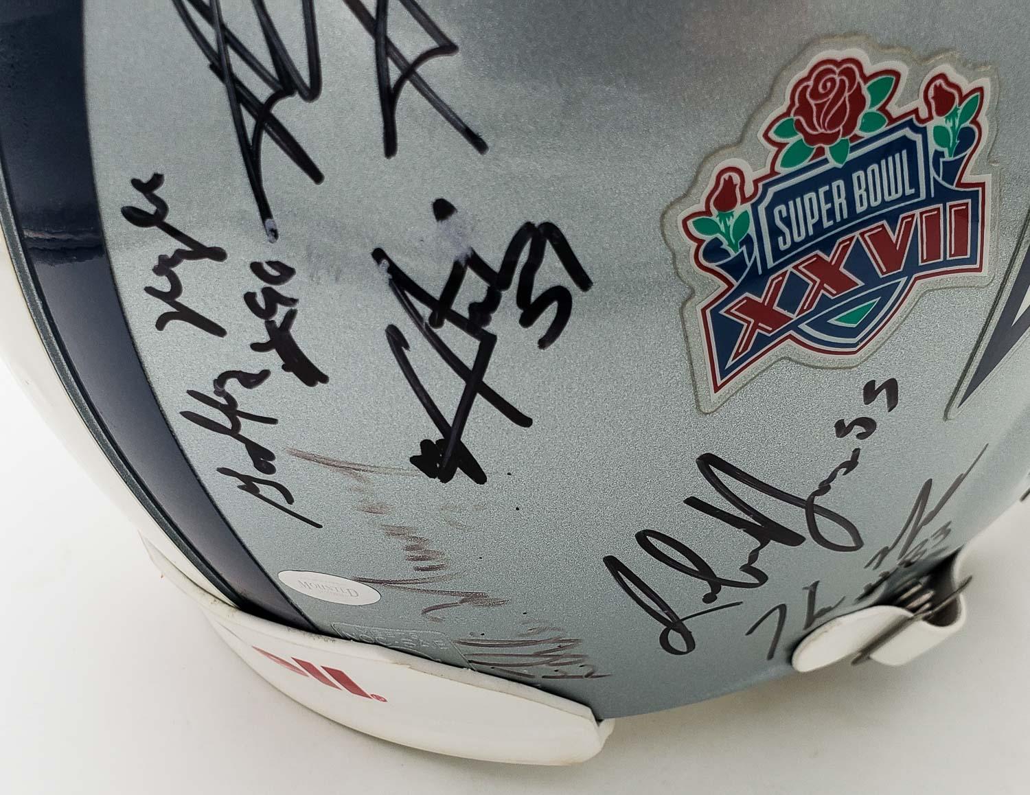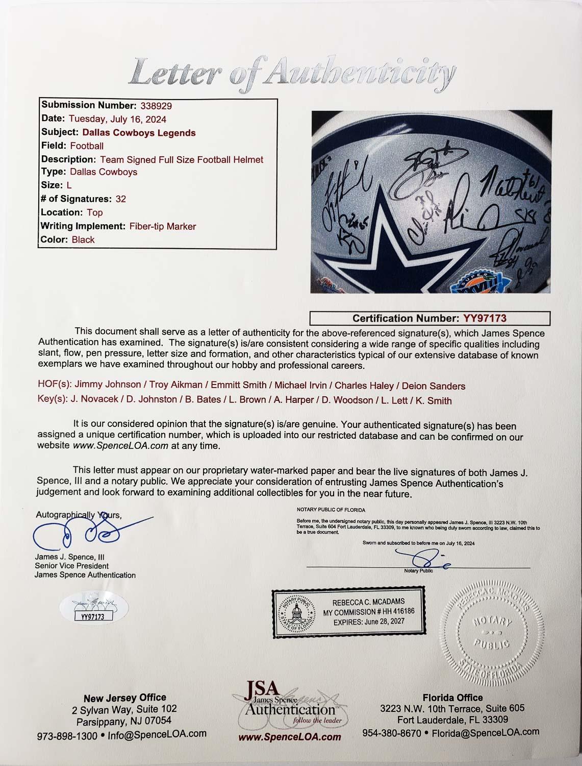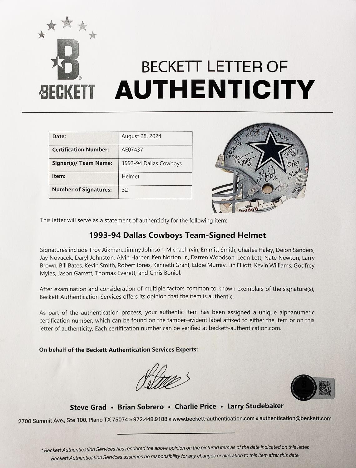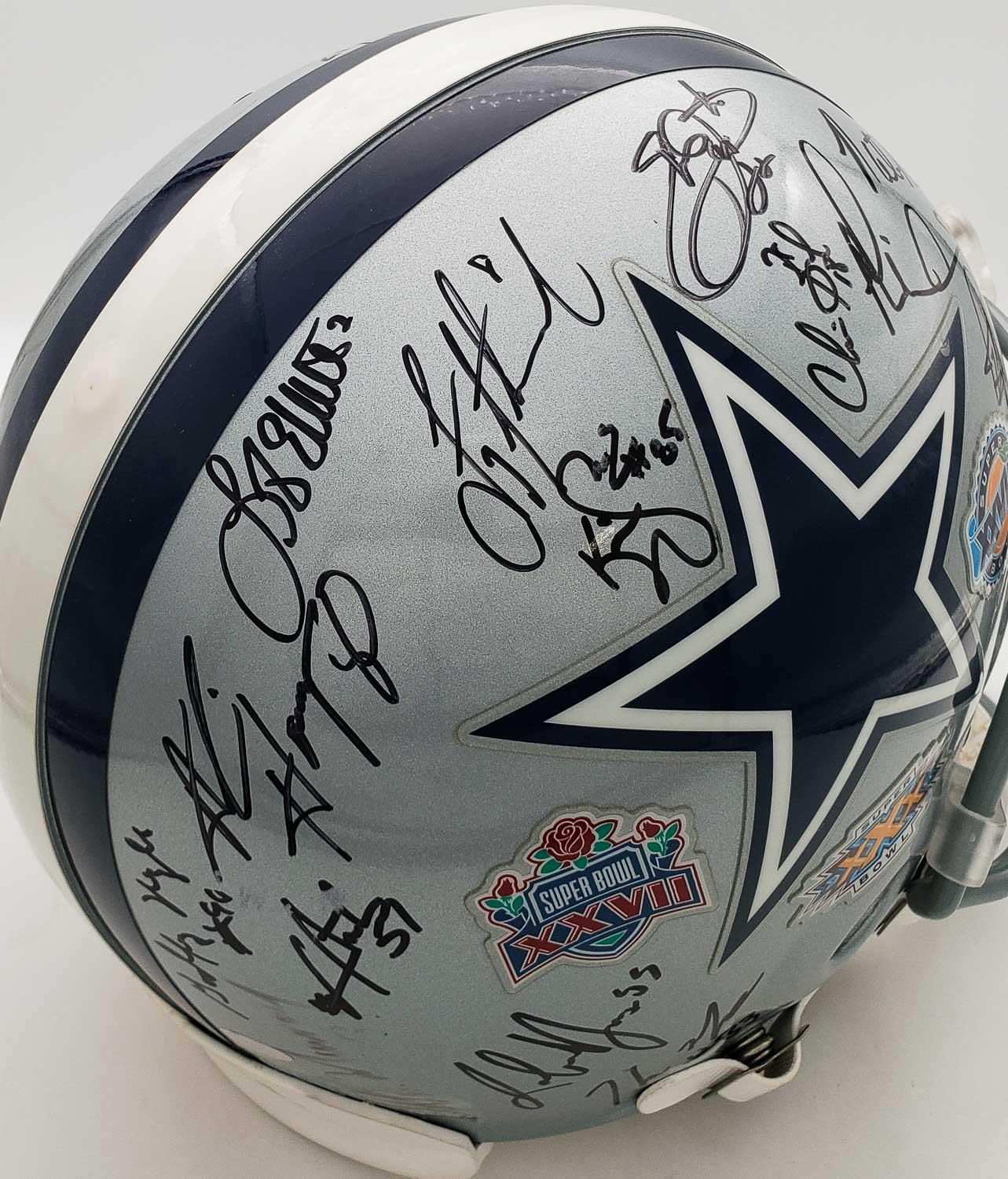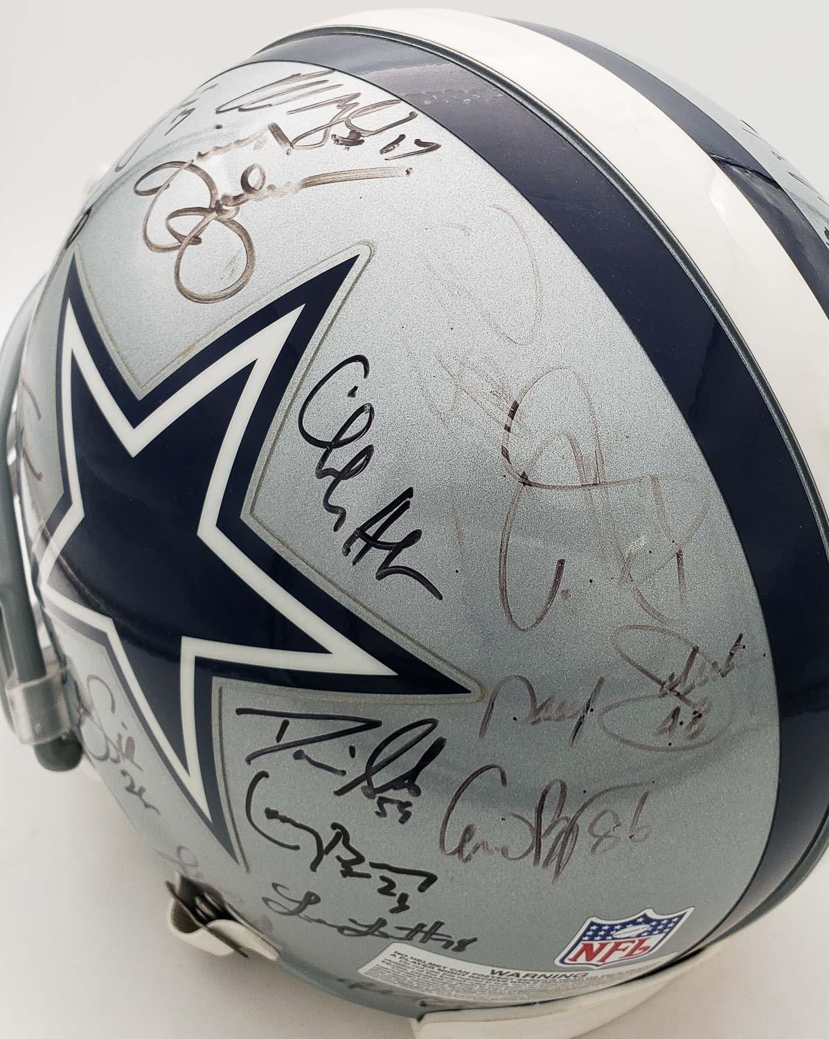 This autographed full size authentic helmet has been personally hand-signed by 32 Dallas Cowboys legends. Signatures include Jimmy Johnson, Troy Aikman, Emmitt Smith, Michael Irvin, Charles Haley, Deion Sanders, Jay Novacek, Daryl Johnston, Bill Bates, Larry Brown, Alvin Harper, Darren Woodson, Leon Lett, Kevin Smith, Ken Norton Jr, Nate Newton, Robert Jones, Jason Garrett, Thomas Everett & many more. These autographs are certified by both Beckett & JSA. It comes with the numbered holograms and matching Letters of Authenticity.