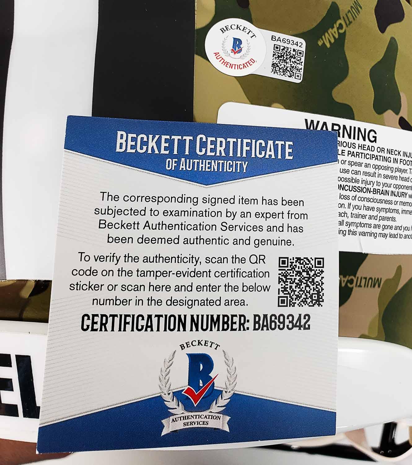 This autographed full size Riddell Camo Alternate authentic Speed helmet has been personally hand-signed by Jim Brown of the Cleveland Browns. This autograph is certified by Beckett Authentication Services (BAS) Witness Certification. That means that a Beckett representative was present when this item was signed. It comes with the numbered authentication hologram with a QR code that verifies the authentication on the Beckett website.