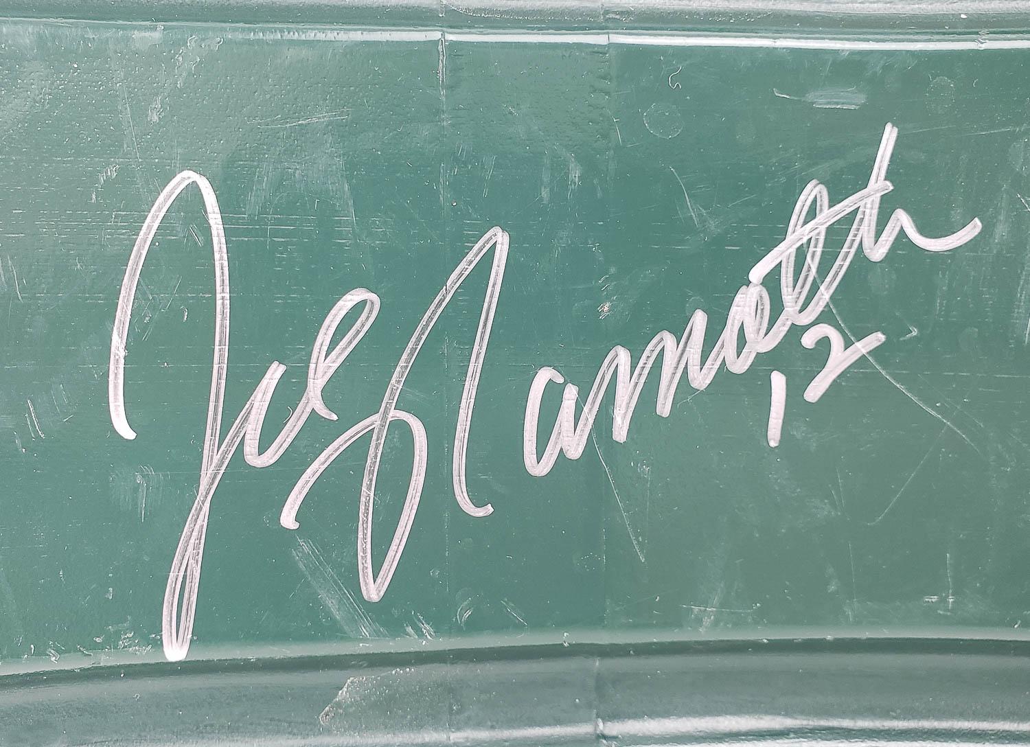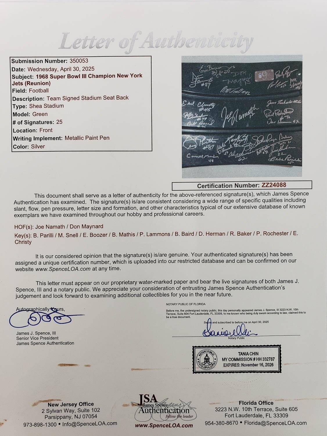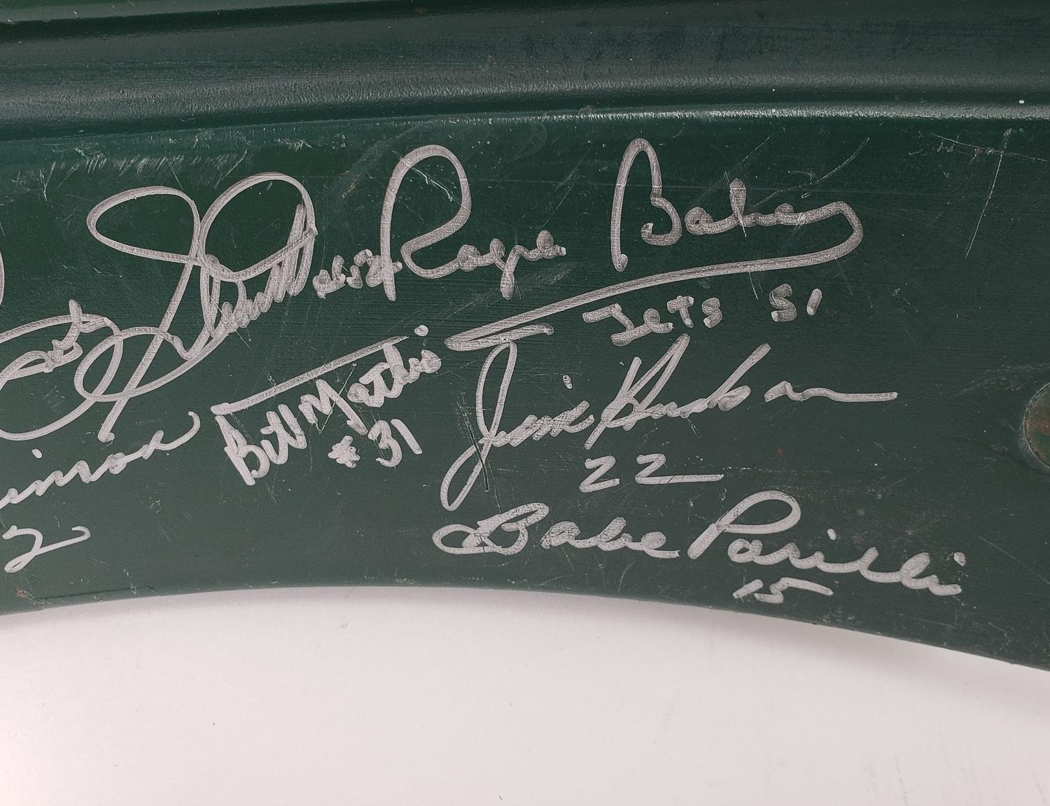 This autographed Shea Stadium Seatback has been personally hand-signed by 25 members of the 1969 Super Bowl III Champion, New York Jets. Key signatures include Joe Namath, Don Maynard, Babe Parilli, Matt Snell, Emerson Boozer and more. These autographs are certified by James Spence Authentication (JSA). It comes with the numbered hologram and matching Letter of Authenticity.