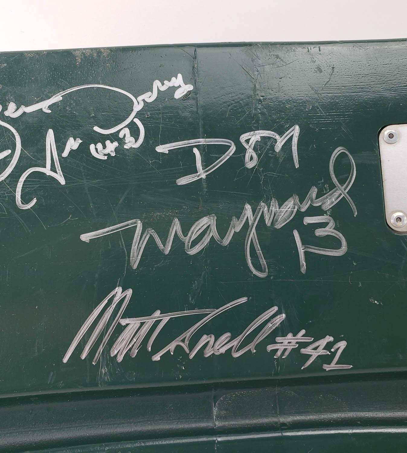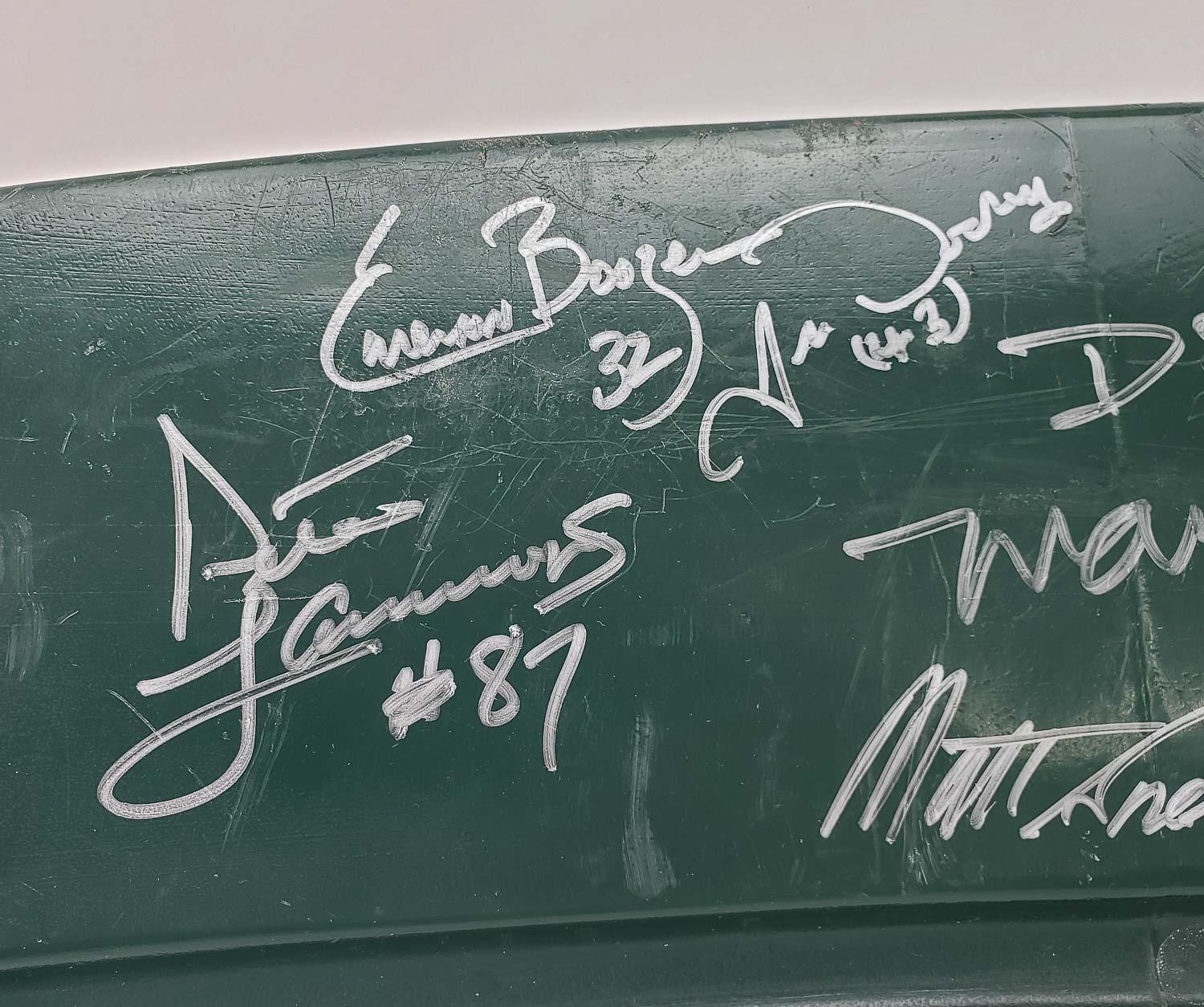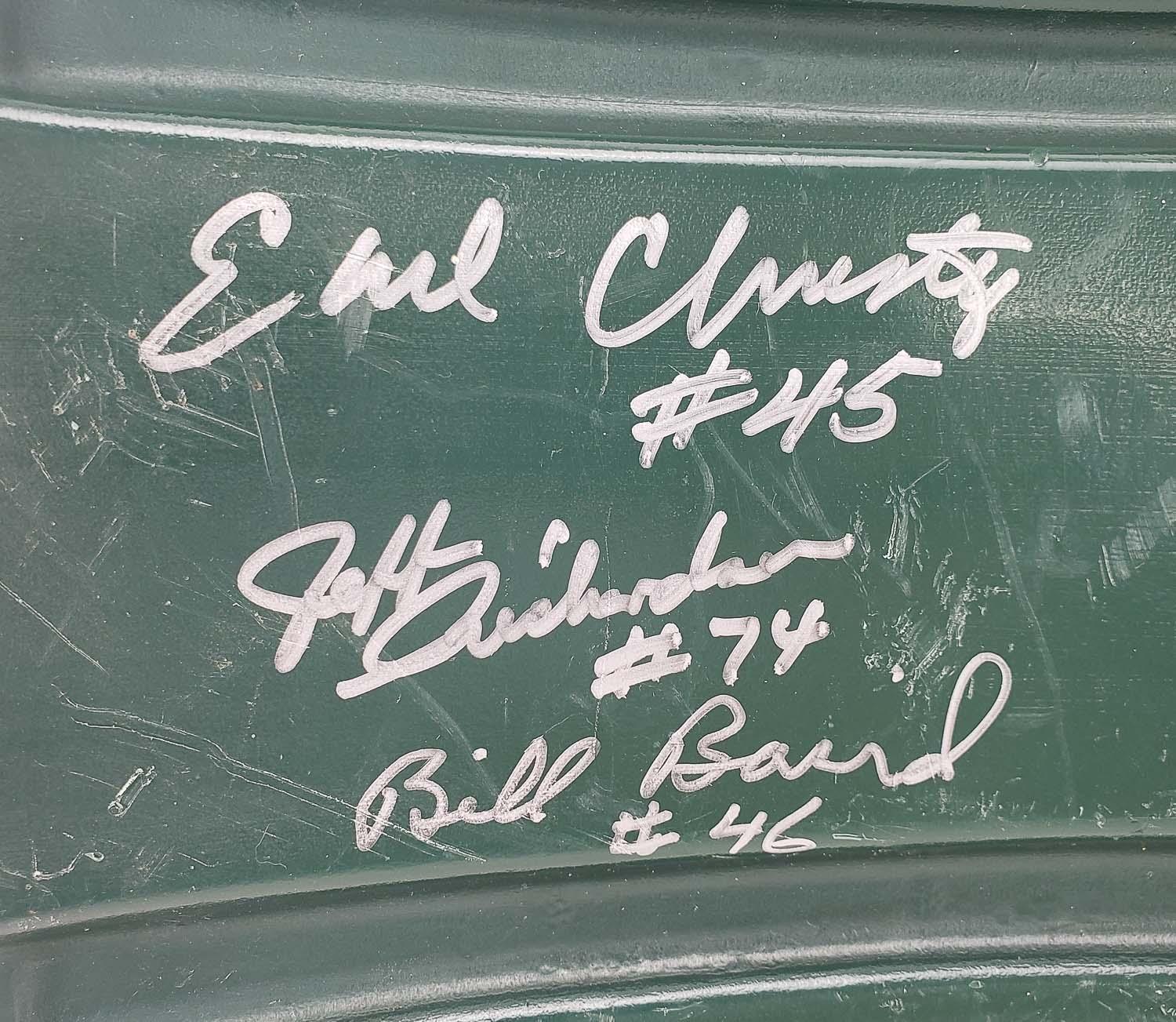 This autographed Shea Stadium Seatback has been personally hand-signed by 25 members of the 1969 Super Bowl III Champion, New York Jets. Key signatures include Joe Namath, Don Maynard, Babe Parilli, Matt Snell, Emerson Boozer and more. These autographs are certified by James Spence Authentication (JSA). It comes with the numbered hologram and matching Letter of Authenticity.