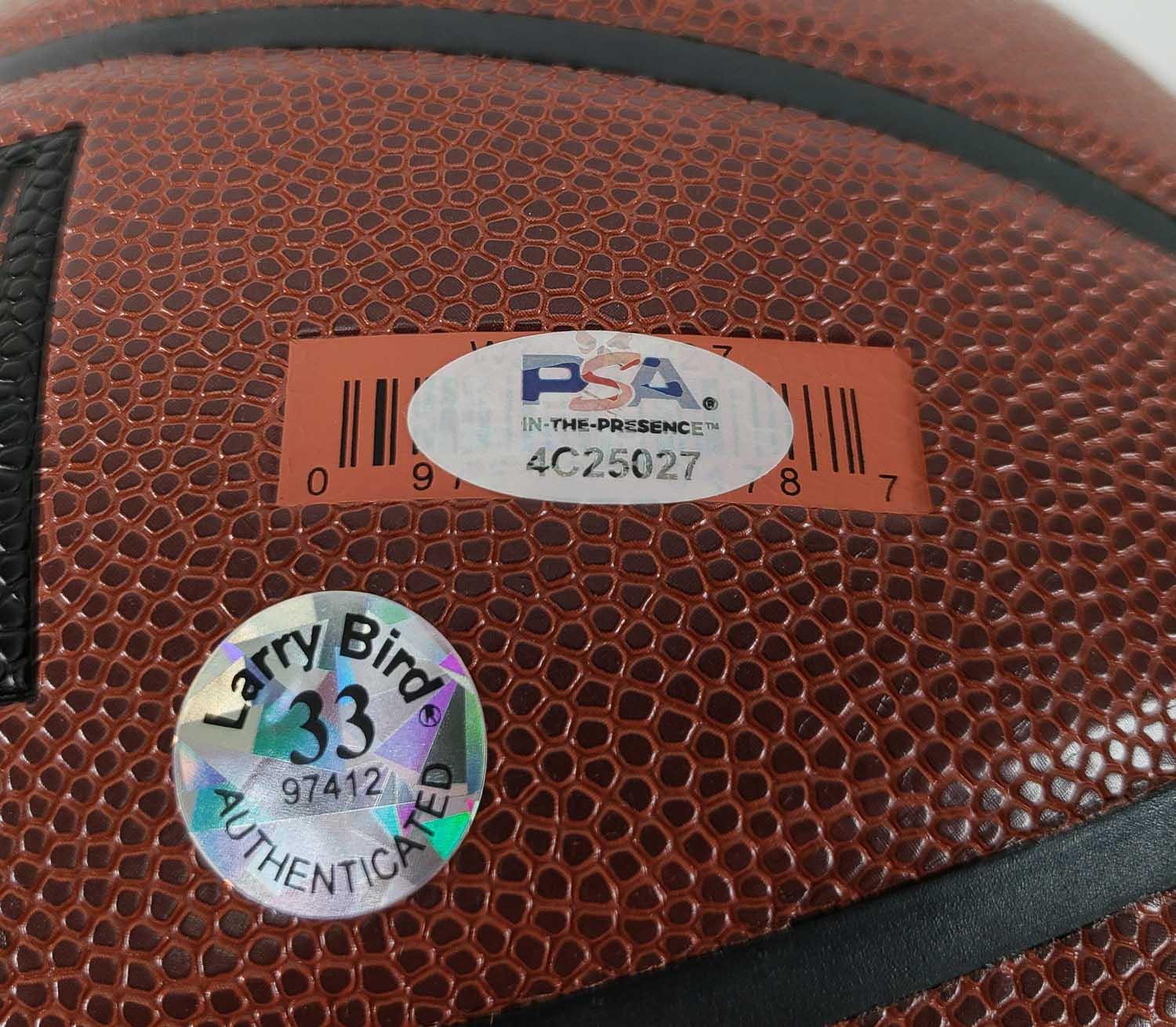 This autographed basketball has been personally hand-signed by Larry Bird of the Boston Celtics. This autograph is certified by PSA/DNA's (Professional Sports Authenticators) In The Presence authentication. That means that a PSA representative was present when this item was signed. It comes with the PSA numbered authentication hologram which can be verified on the PSA website, psacard.com. It also comes with the Larry Bird authentication hologram.