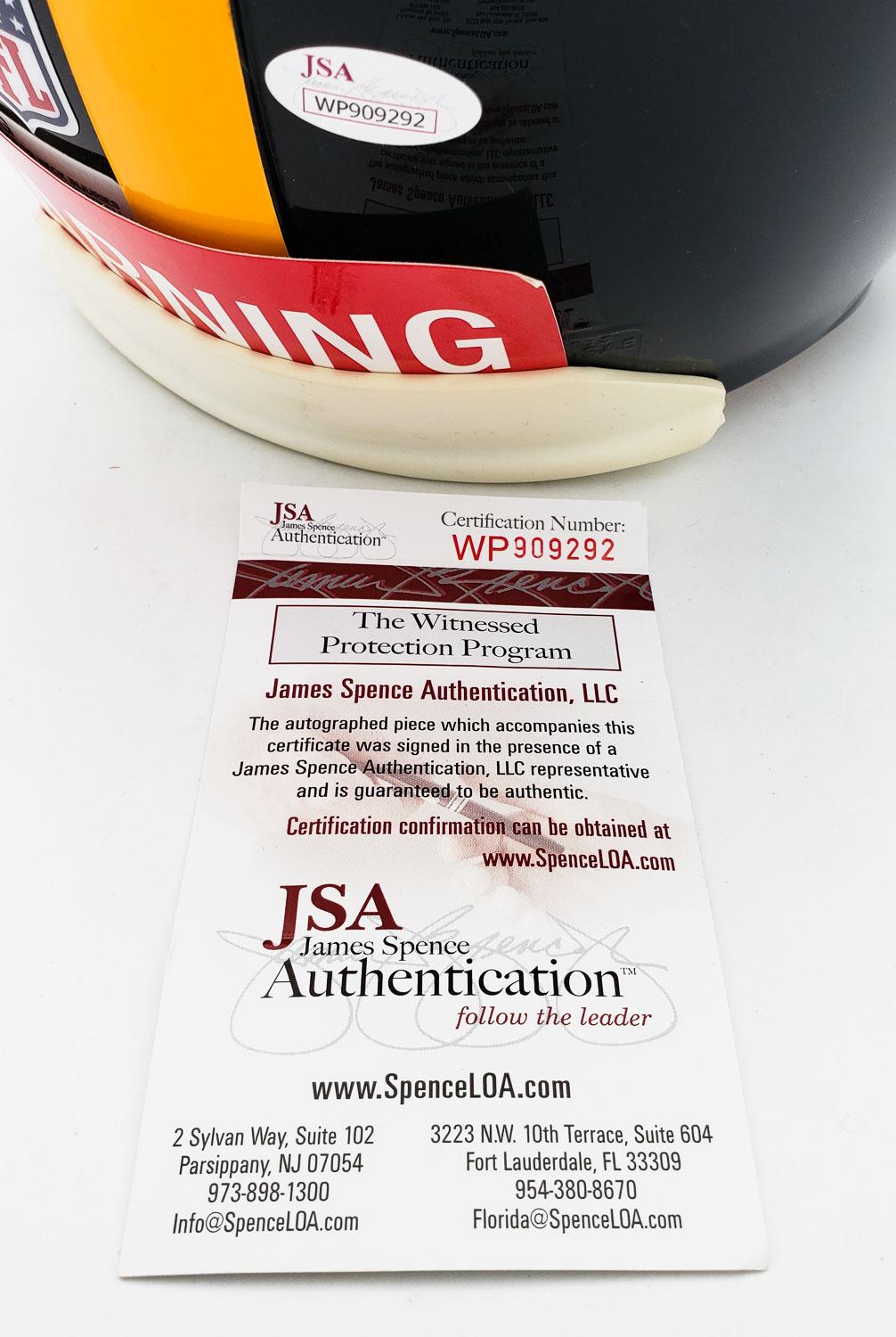 This autographed full size Riddell authentic helmet has been personally hand-signed by Le'Veon Bell of the Pittsburgh Steelers. This autograph is certified by James Spence Authentication's (JSA) Witnessed Protection Program. That means that a JSA representative was present when this item was signed. It comes with the numbered hologram and matching Certificate of Authenticity.