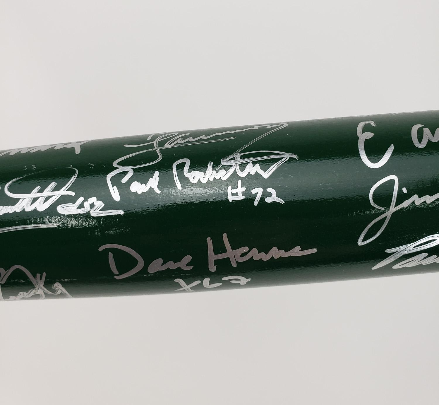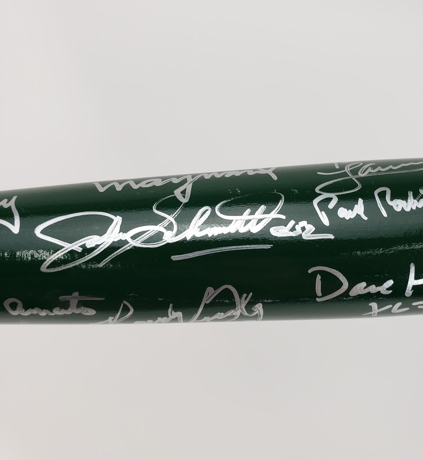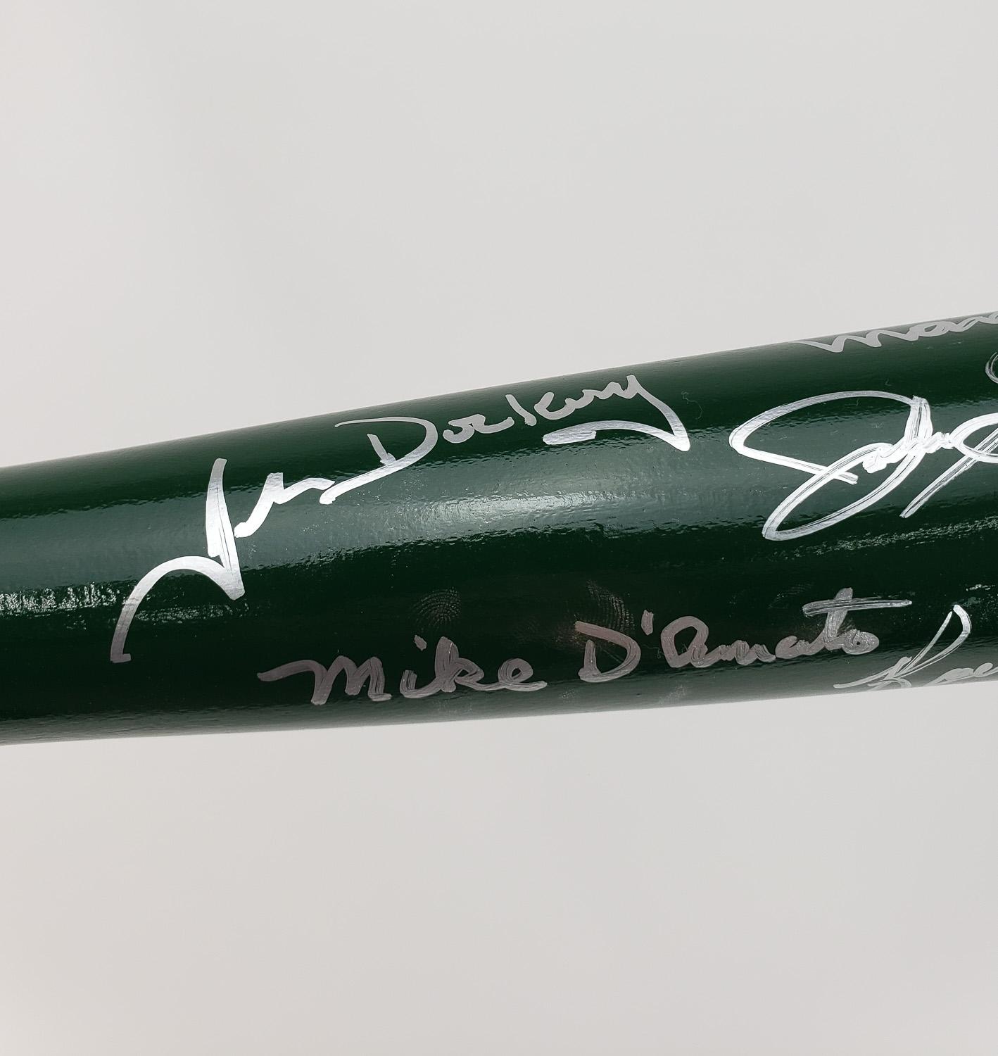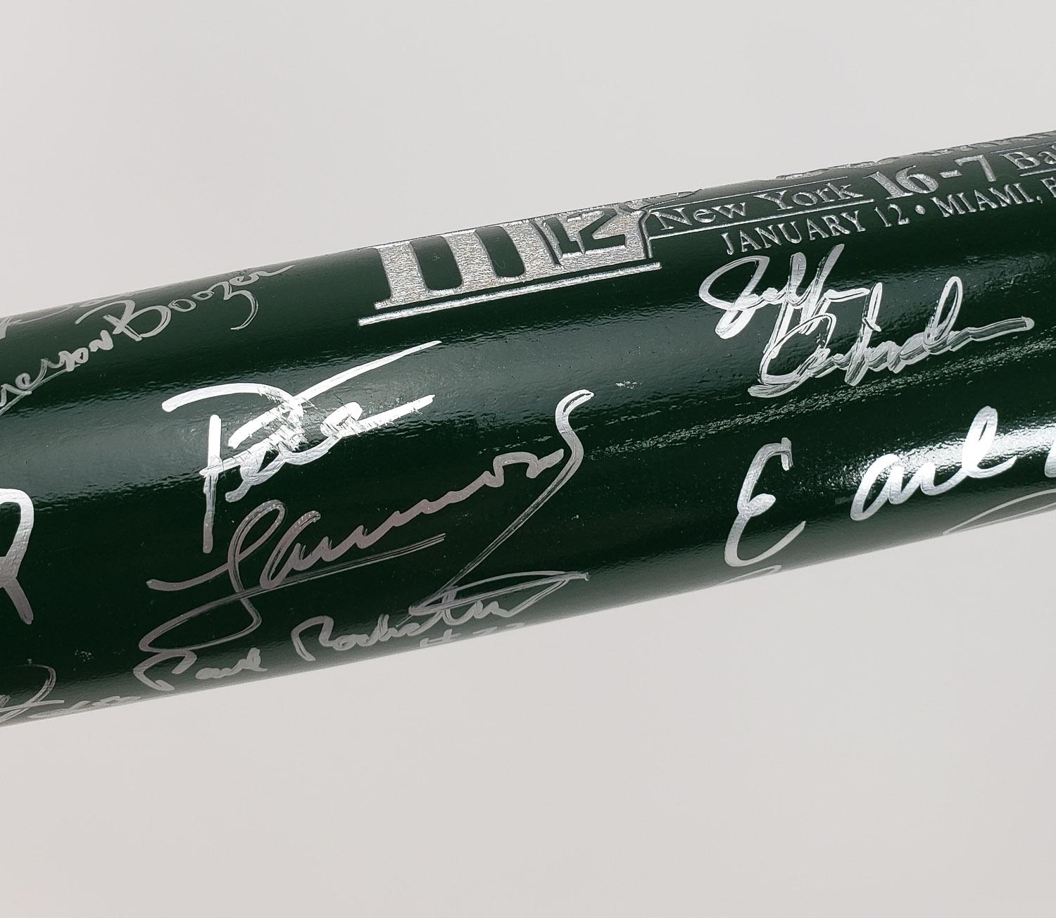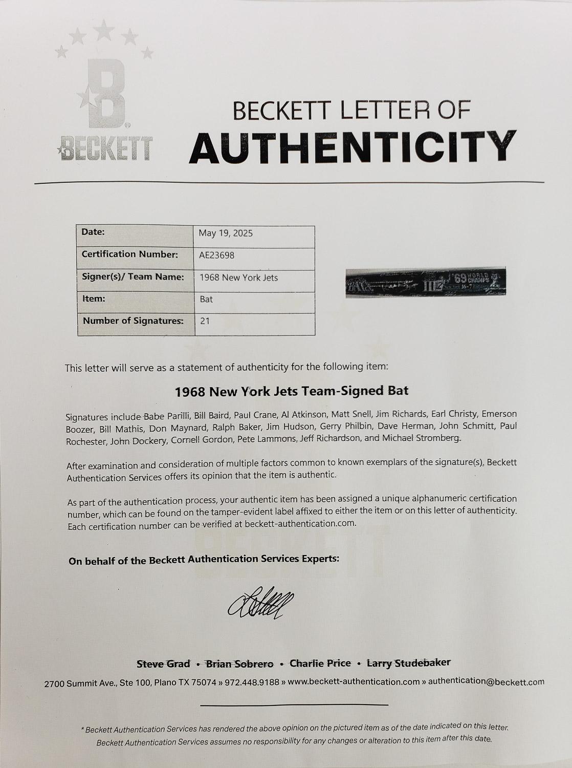 This autographed baseball bat has been personally hand-signed by 21 members of the 1968 New York Jets. The Jets won the 1969 Super Bowl over the heavily favored Baltimore Colts. Signatures include Babe Parilli, Bill Baird, Paul Crane, Matt Snell, Jim Richards, Earl Christy, Emerson Boozer, Bill Mathis, Don Maynard, Ralph Baker, Jim Hudson, Gerry Philbin, Dave Herman, John Schmitt, Paul Rochester, John Dockery, Cornell Gordon, Pete Lammons, Jeff Richardson & Michael Stromberg. These autographs are certified by Beckett Authentication Services (BAS). It comes with the numbered hologram and matching Letter of Authenticity.