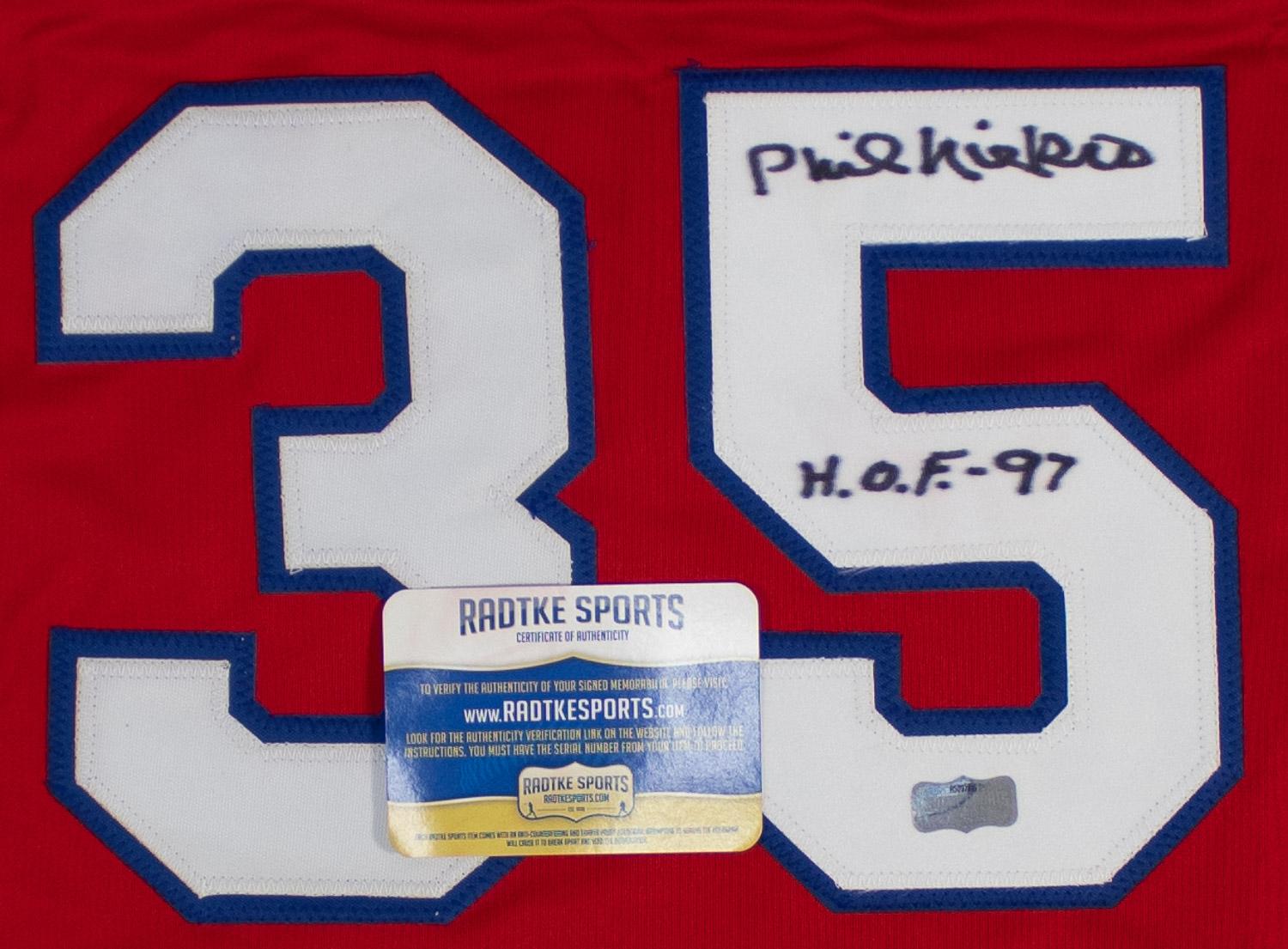 This autographed jersey has been personally hand-signed by Phil Niekro("H.O.F.-97" inscription) of the Atlanta Braves. This autograph is certified by Radtke Sports. It comes with the Certificate of Authenticity and matching numbered hologram, which can be verified on their website, Radtkesports.com.