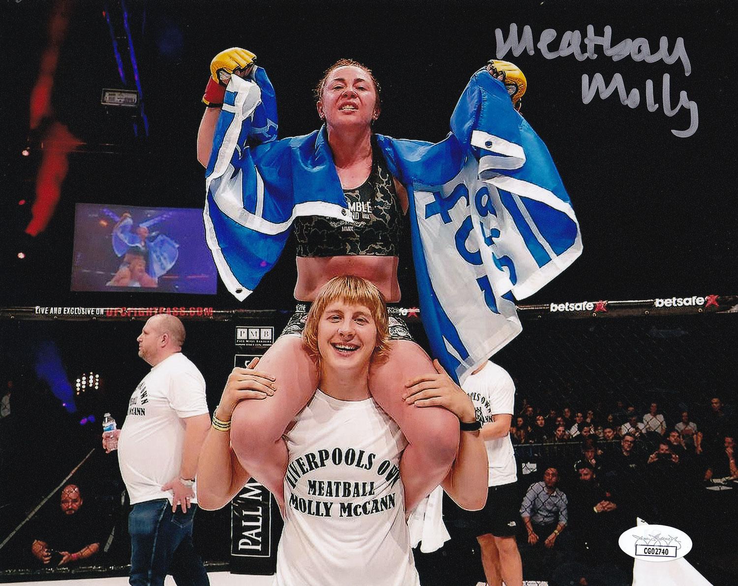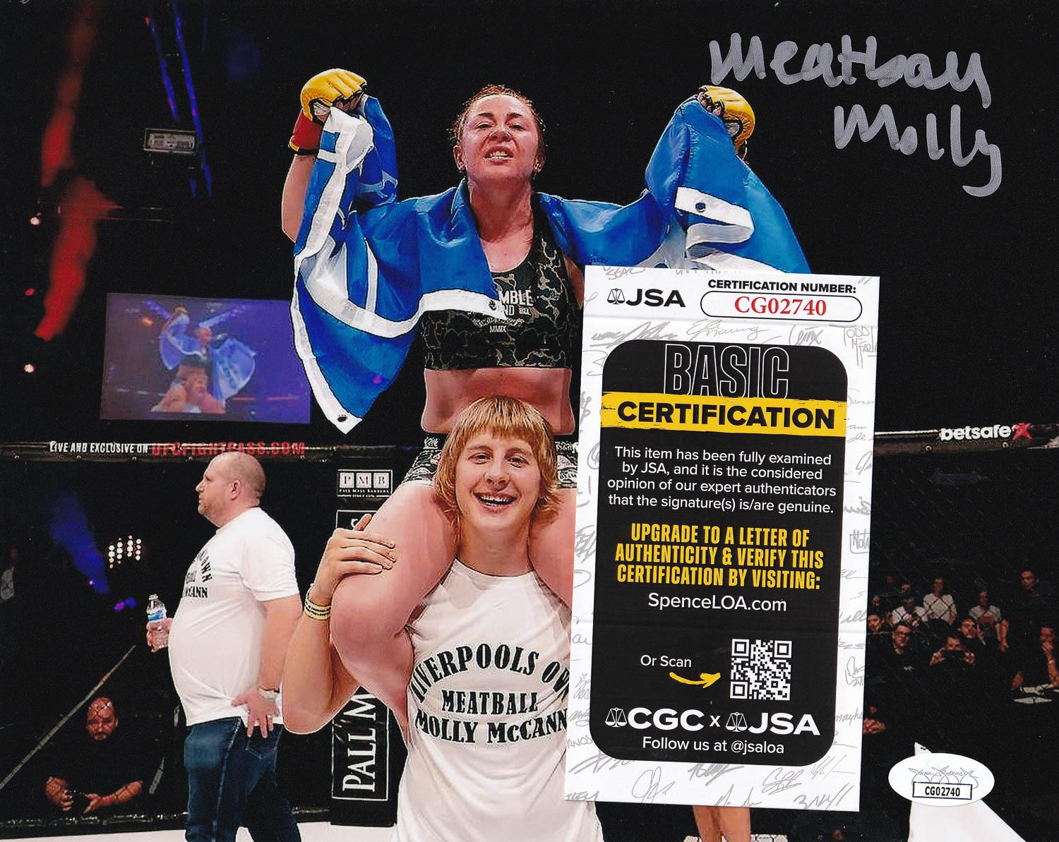 This autographed 8x10 photo has been personally hand-signed by MMA fighter, Molly McCann("Meatball Molly" inscription). This autograph is certified by James Spence Authentication (JSA). It comes with the numbered hologram and matching Certificate of Authenticity.
