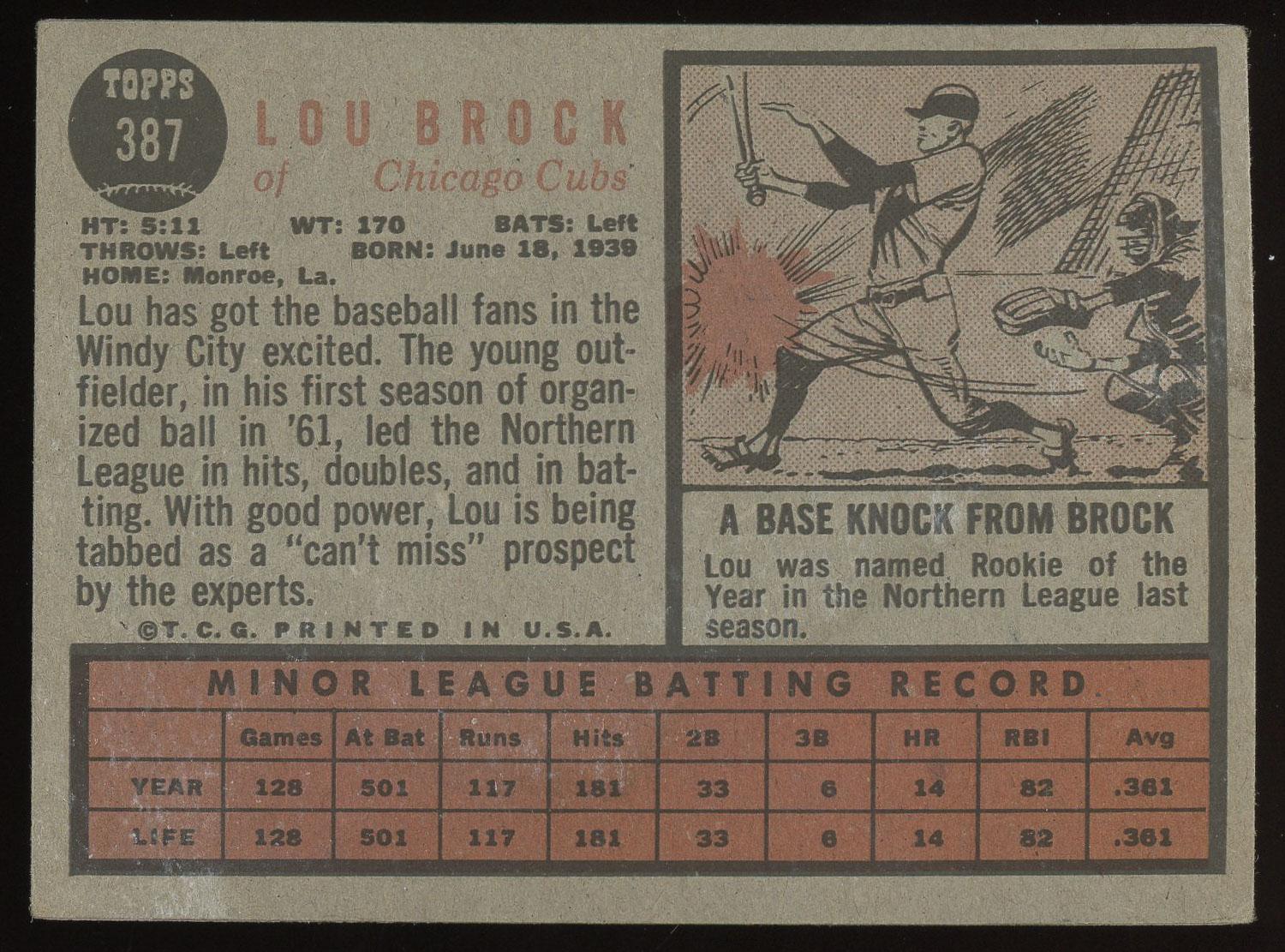 Lou Brock 1962 Topps Rookie Card #387. Please see pictures for details on the condition of this card.