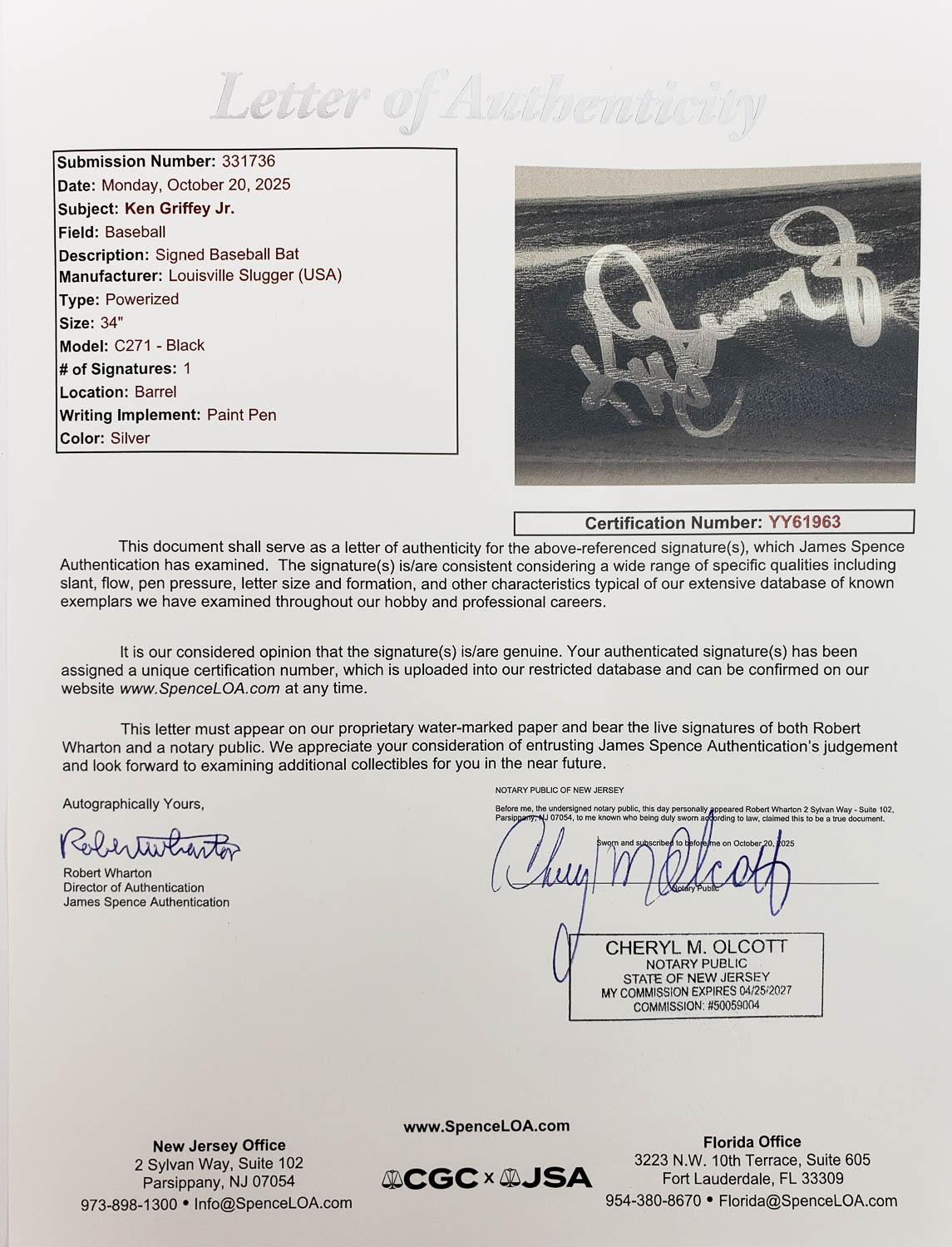 This autographed bat has been personally hand-signed by Ken Griffey Jr of the Seattle Mariners. This autograph is certified by James Spence Authentication (JSA). It comes with the numbered hologram and matching Letter of Authenticity.