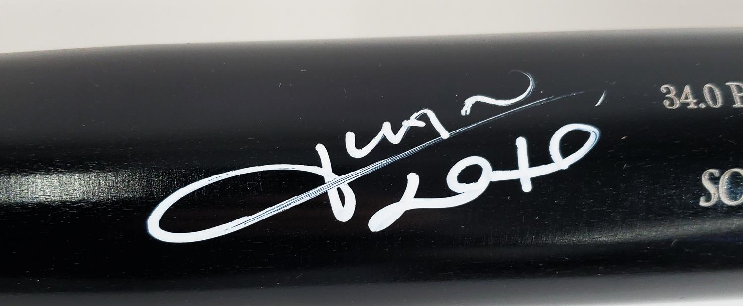 This autographed baseball bat has been personally hand-signed by Juan Soto of the New York Mets. This autograph is certified by Beckett Authentication Services (BAS). It comes with the numbered authentication hologram with a QR code that verifies the authentication on the Beckett website.